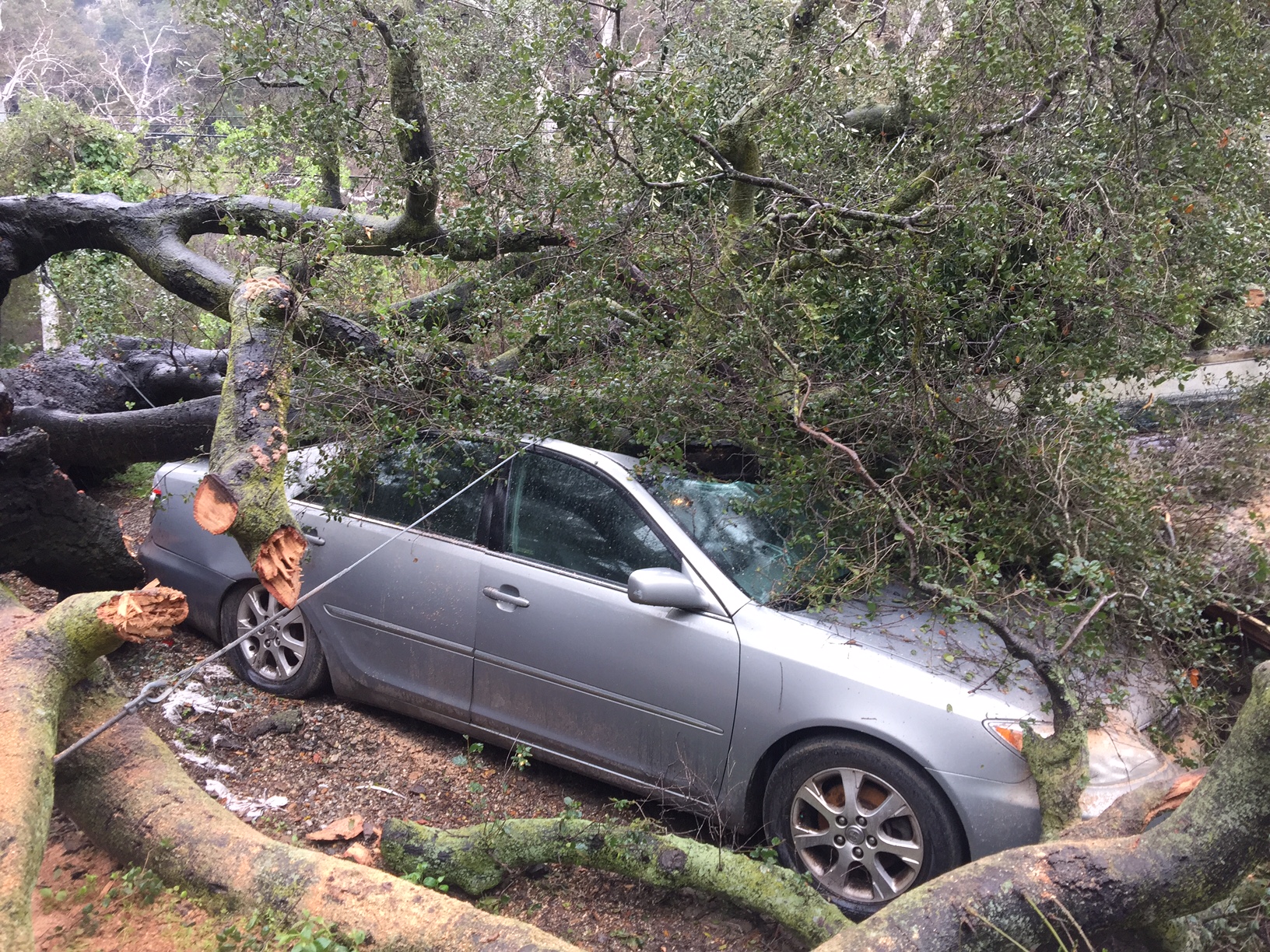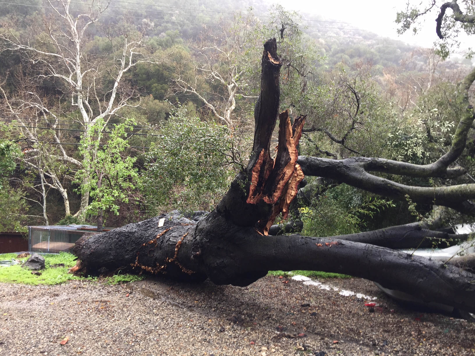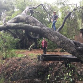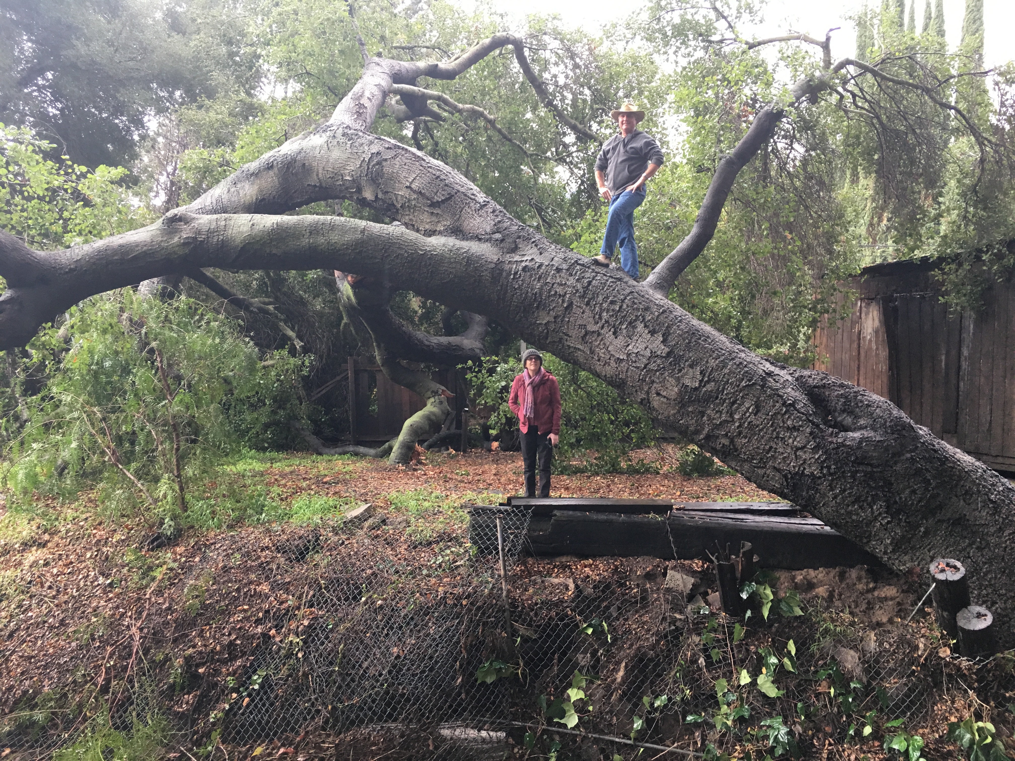 A 350-year- old coast live oak tree, registered in 1965 as “Big Mike,” fell onto Bonnell Drive from the backyard of Evelyn and Russ Jensen. Son, Gary, and his wife, Lucy, give some