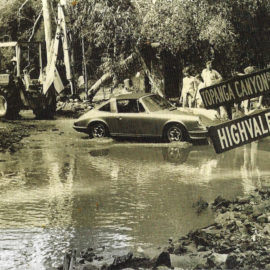 This sports car's owner was actually lucky; many cars were lost to the creek in 1980. Courtesy of Topanga Historical Society: “The Topanga Story”