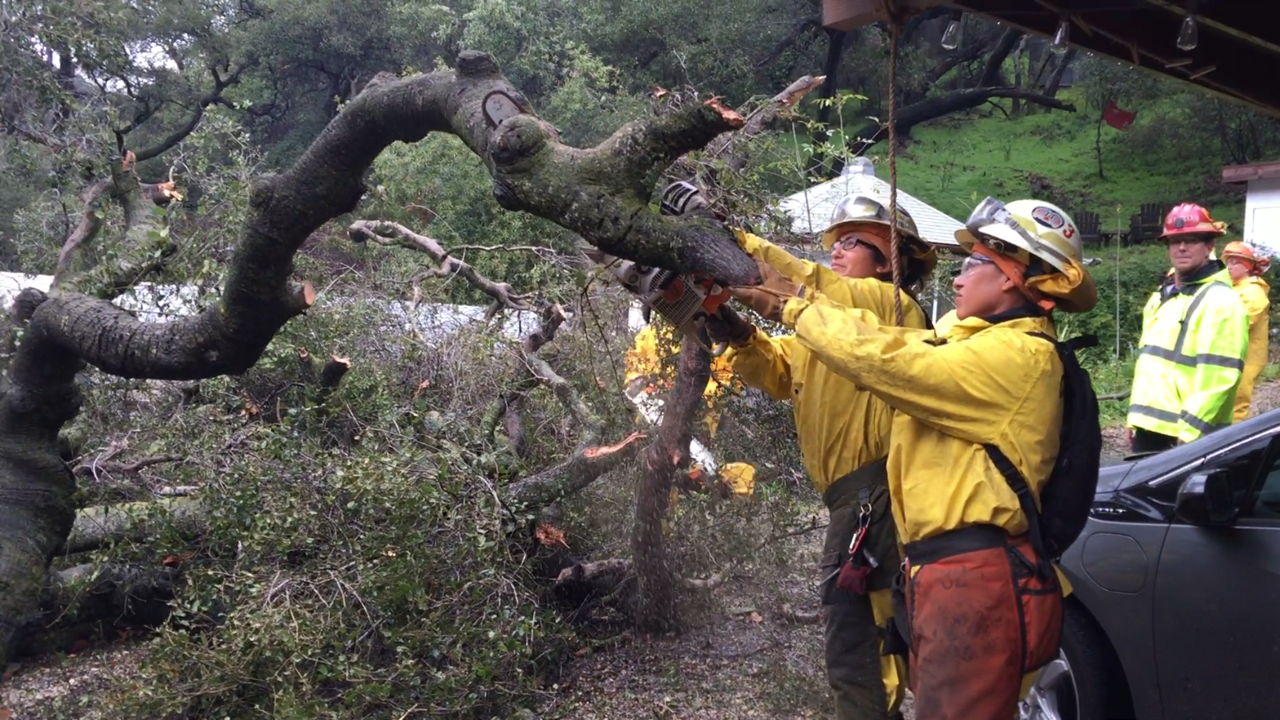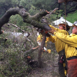 At a residence on Castle Top Trail women firefighters from Camp 13 wielded chain saws