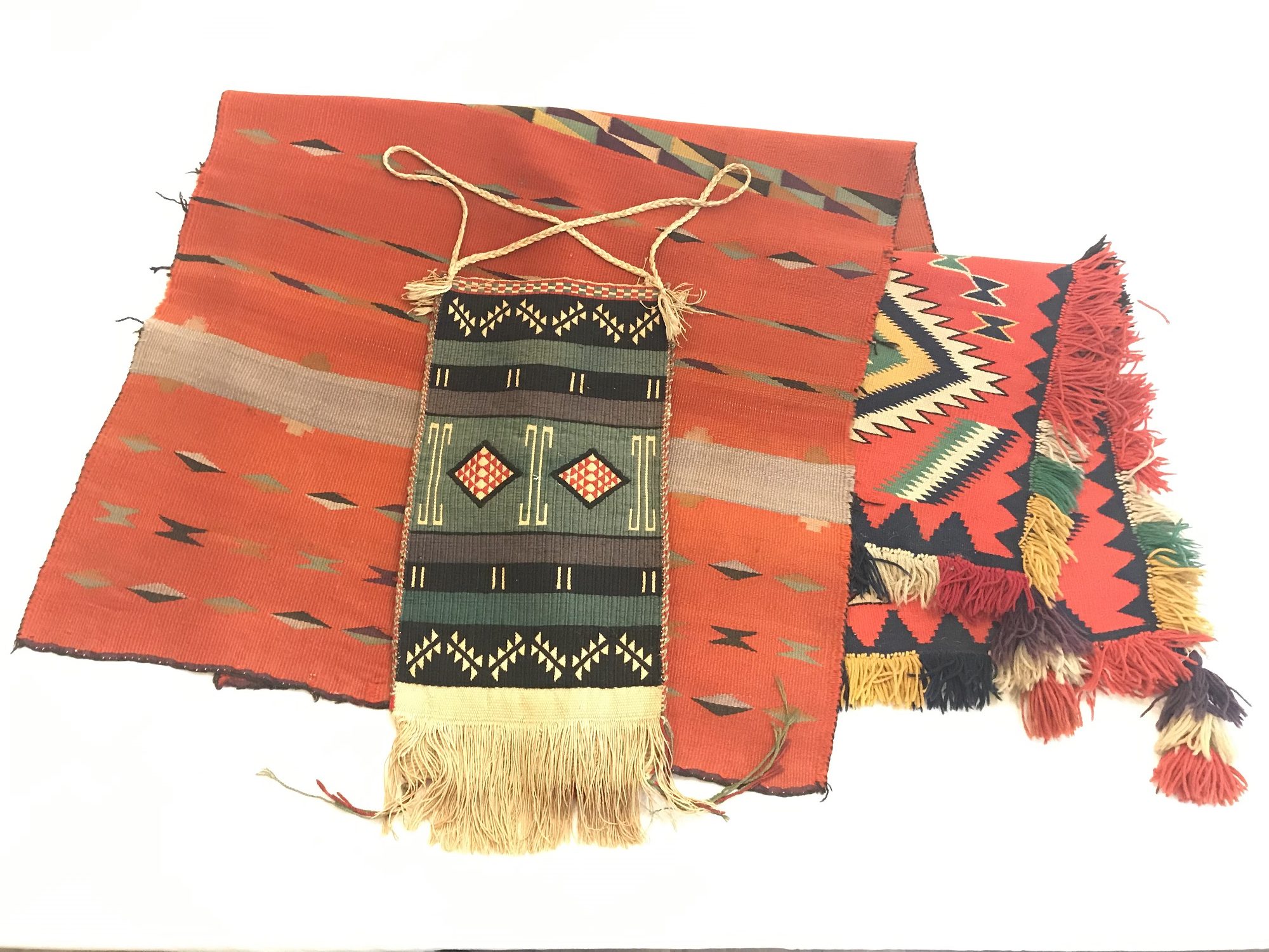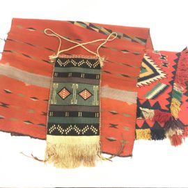 Within a particular Indian culture, artistic styles and forms change over time, just as one sees in the fine arts of Europe or America. Navajo “wearing” blankets evolved from the earliest known, with striped designs of a few basic colors (red, white, blue, brown), through mid-19th century “classic” blankets of the same color palette but influenced by Mexican Saltillo serape designs, to “transitional” blankets of many new colors enabled by aniline dyes and by Germantown trade wools from eastern Pennsylvania.