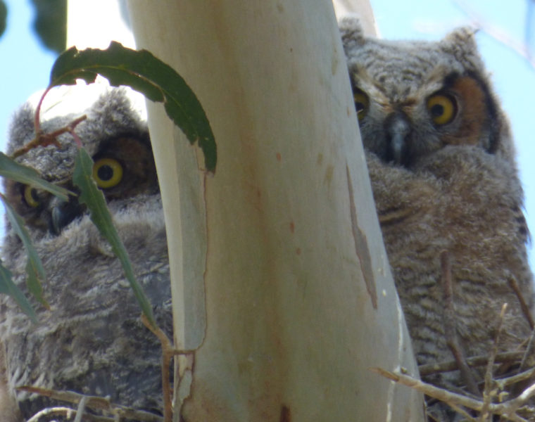 These young great horned owls aren’t old enough to fly but they are big enough to take an interest in the world below their nest at the top of a eucalyptus tree.…