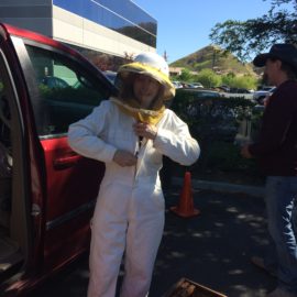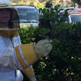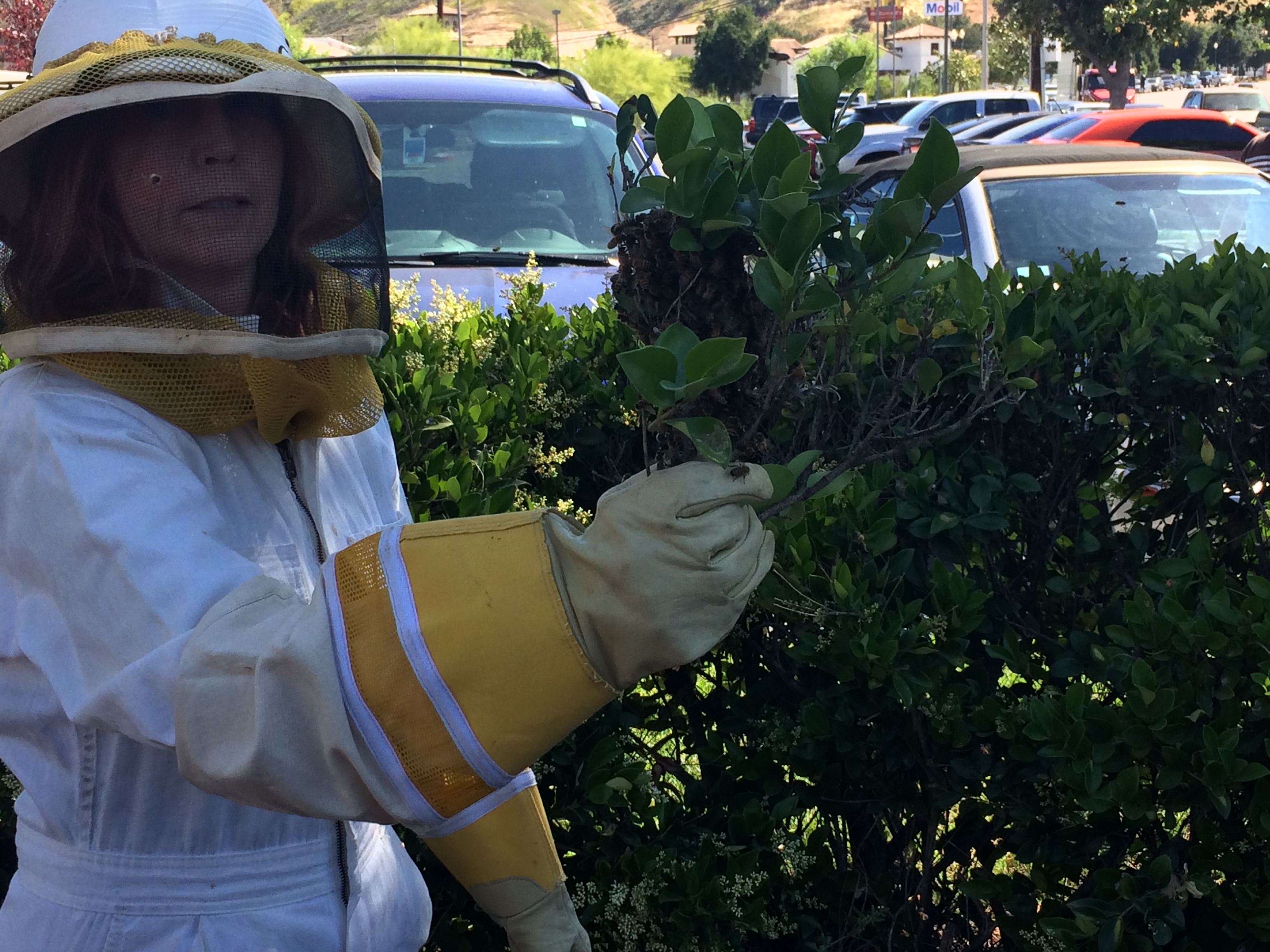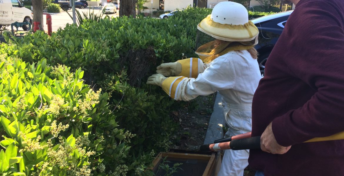 In the afternoon of Thursday, April 28, Fiona Nagle, District Director, West Valley/Mountain Communities with Supervisor Sheila Kuehl, and Field Deputy Blake Clayton were out walking and happened to see a swarm of honeybees landing in a hedge across the street from the district office in Calabasas.