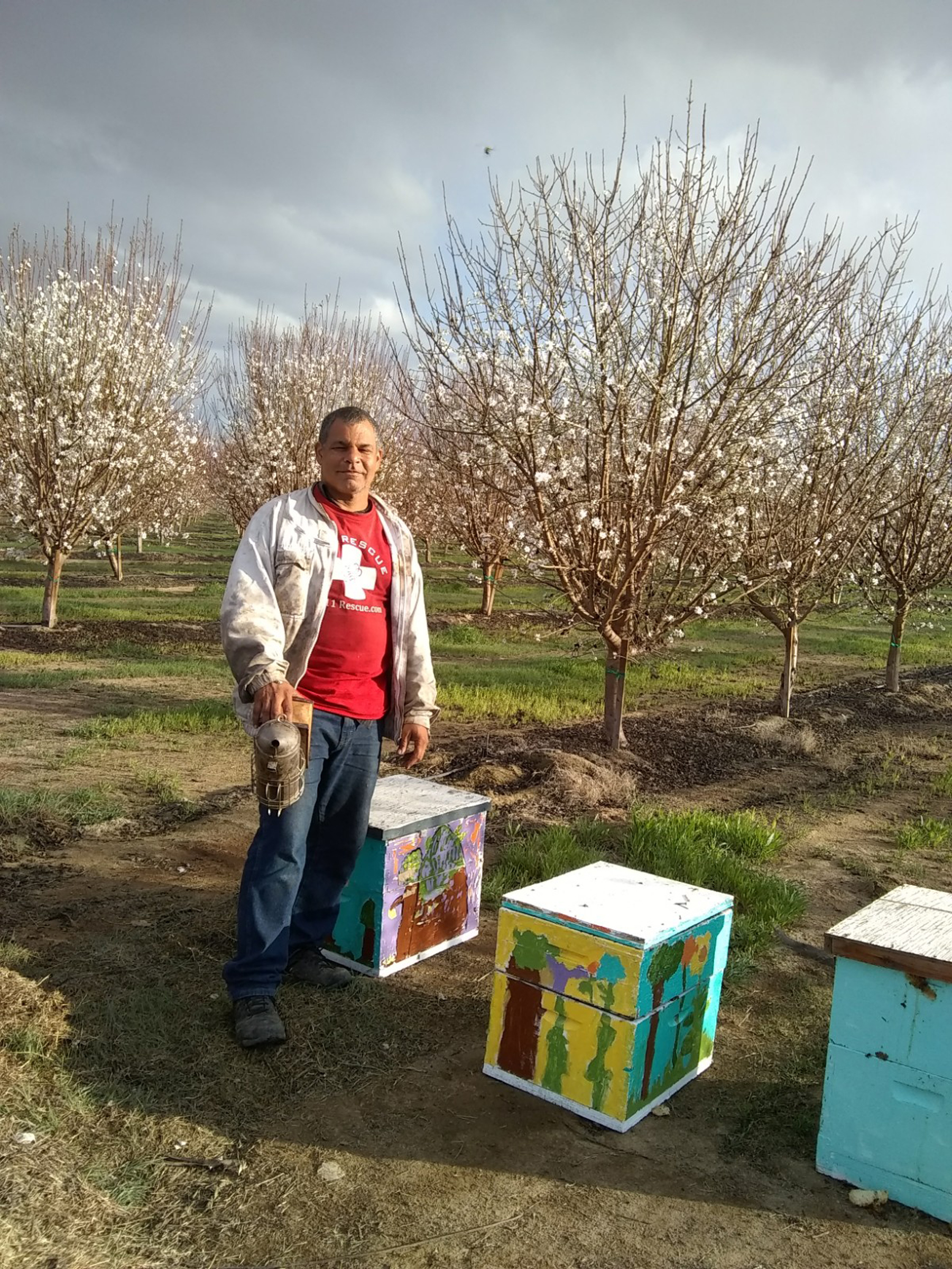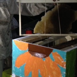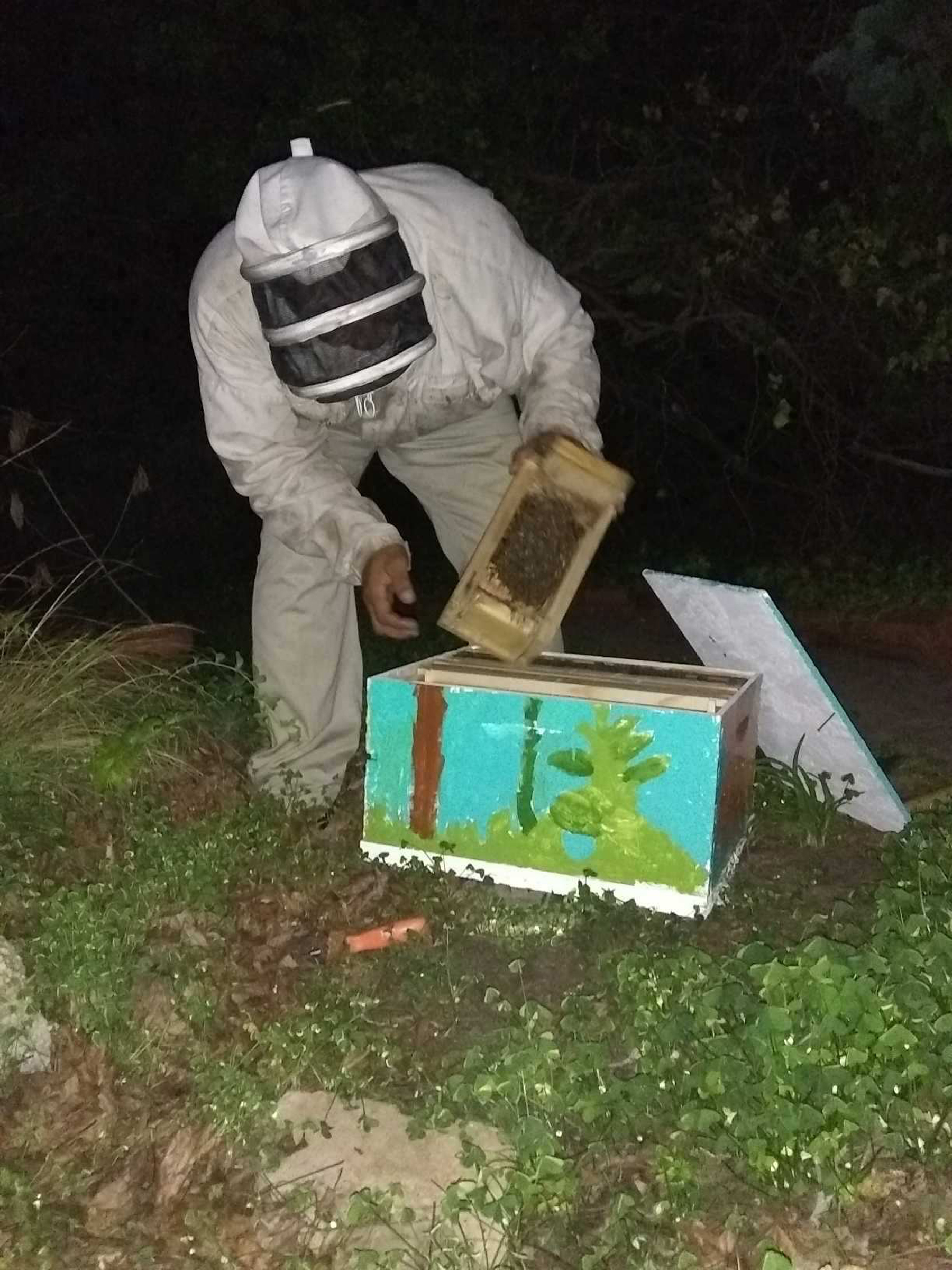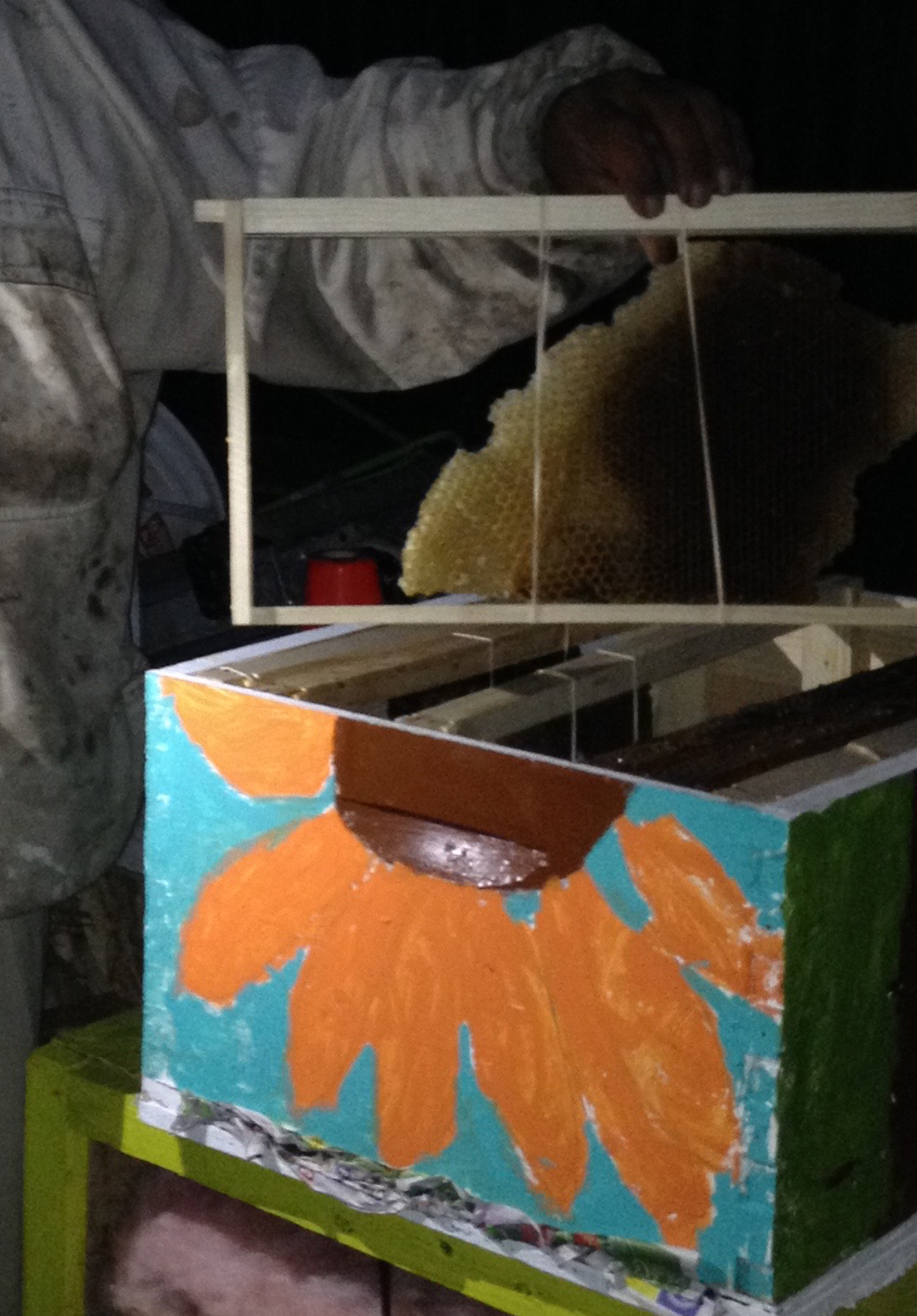 He happened to be in the area working with Westside school children on a bee education project when he got the call about the birdhouse and arrived that evening with one of several hive boxes built and decorated by his young students.