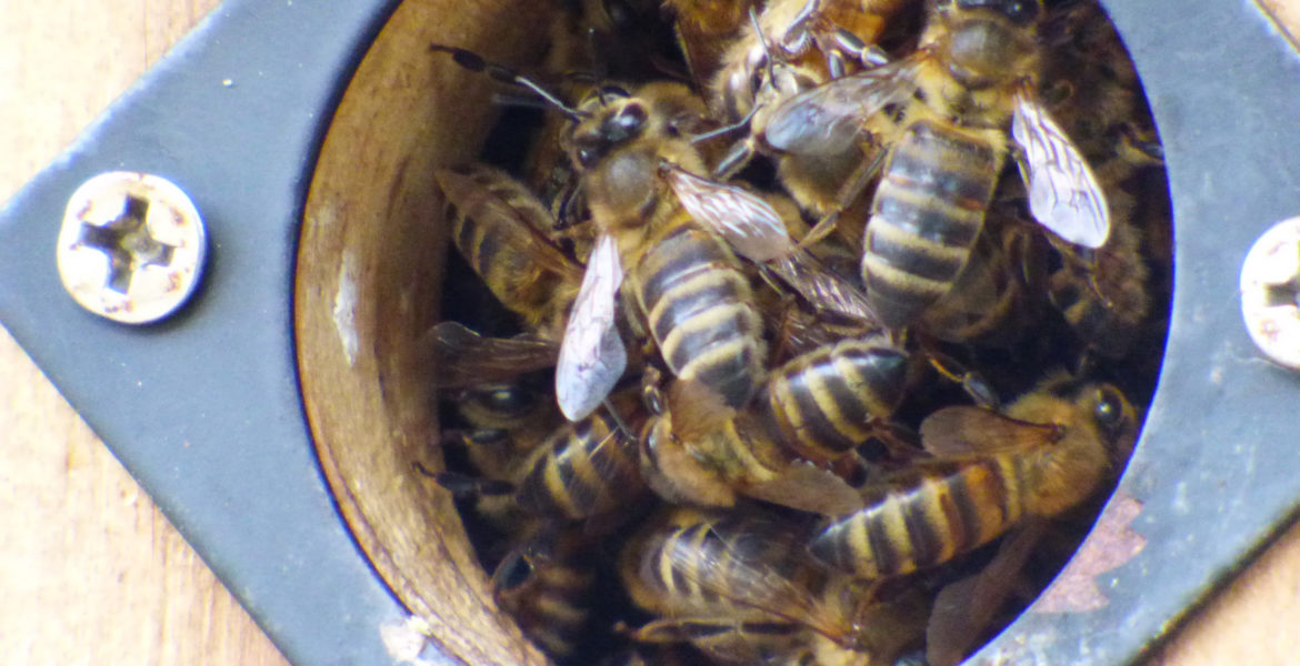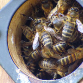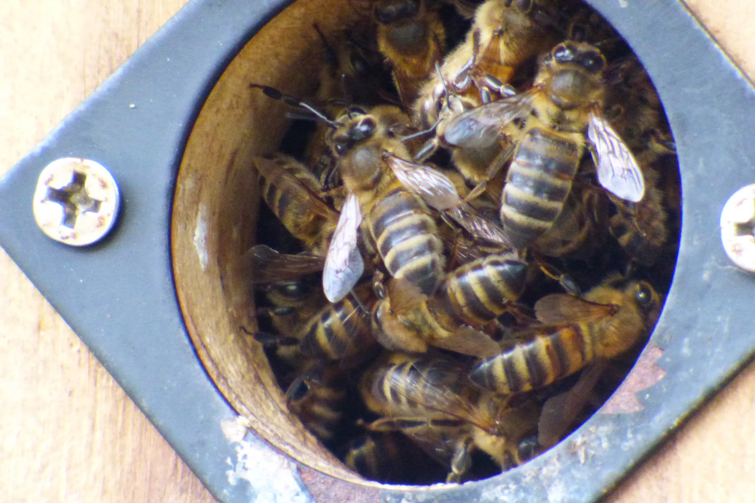 Although the birdhouse bees had only been in the birdhouse for a few days, they had already constructed three combs and were busy filling them with honey and pollen.