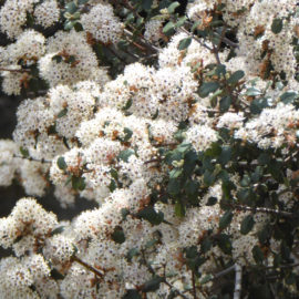 Cuneatus, commonly called buckbrush, thrives away from the coast. C. megacarpus, or big pod ceanothus, is the white-blooming ceanothus of the coastal canyons. These two species cover the hills with snow-like blossoms and are among the first native flowers to bloom after the rains arrive.