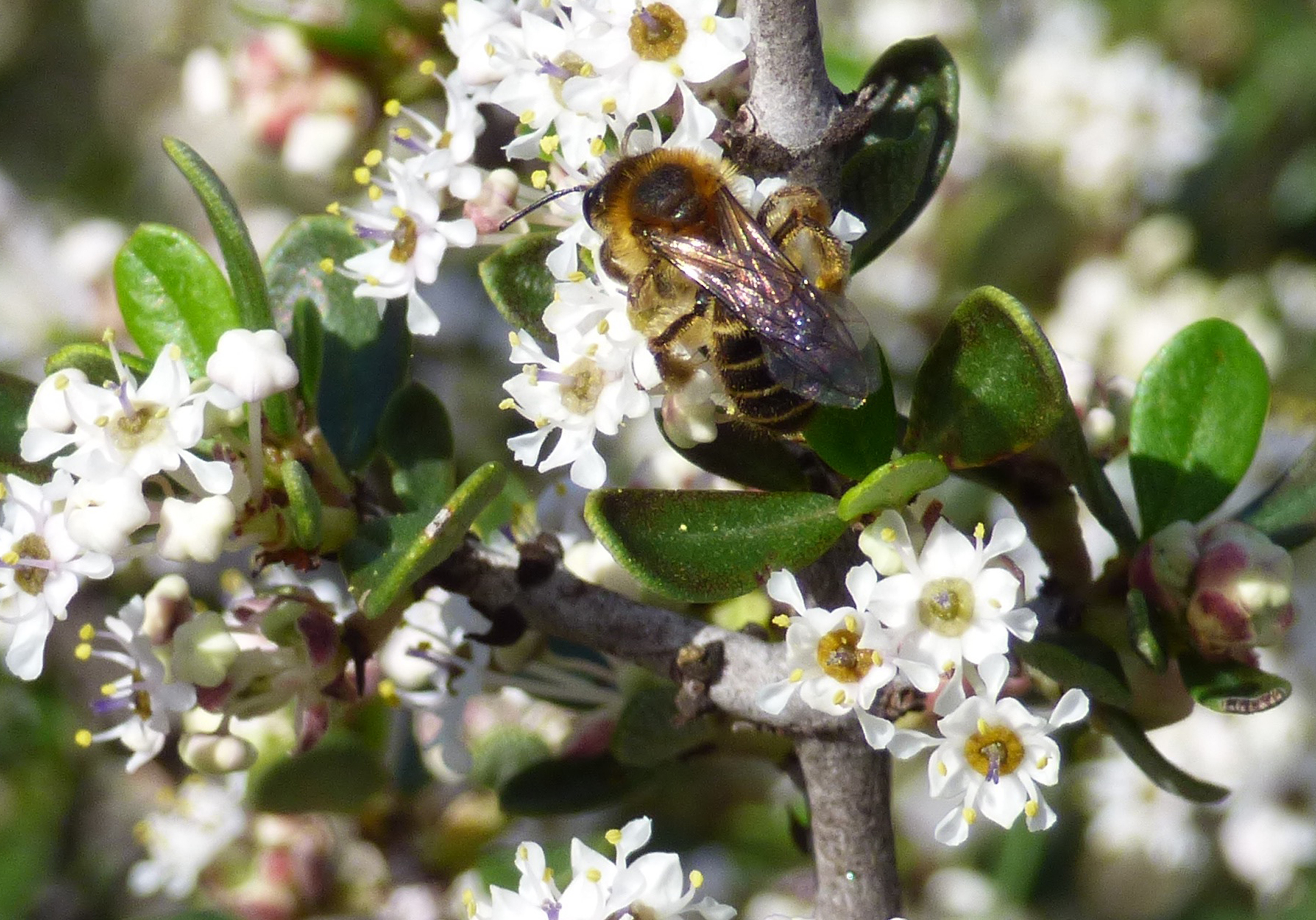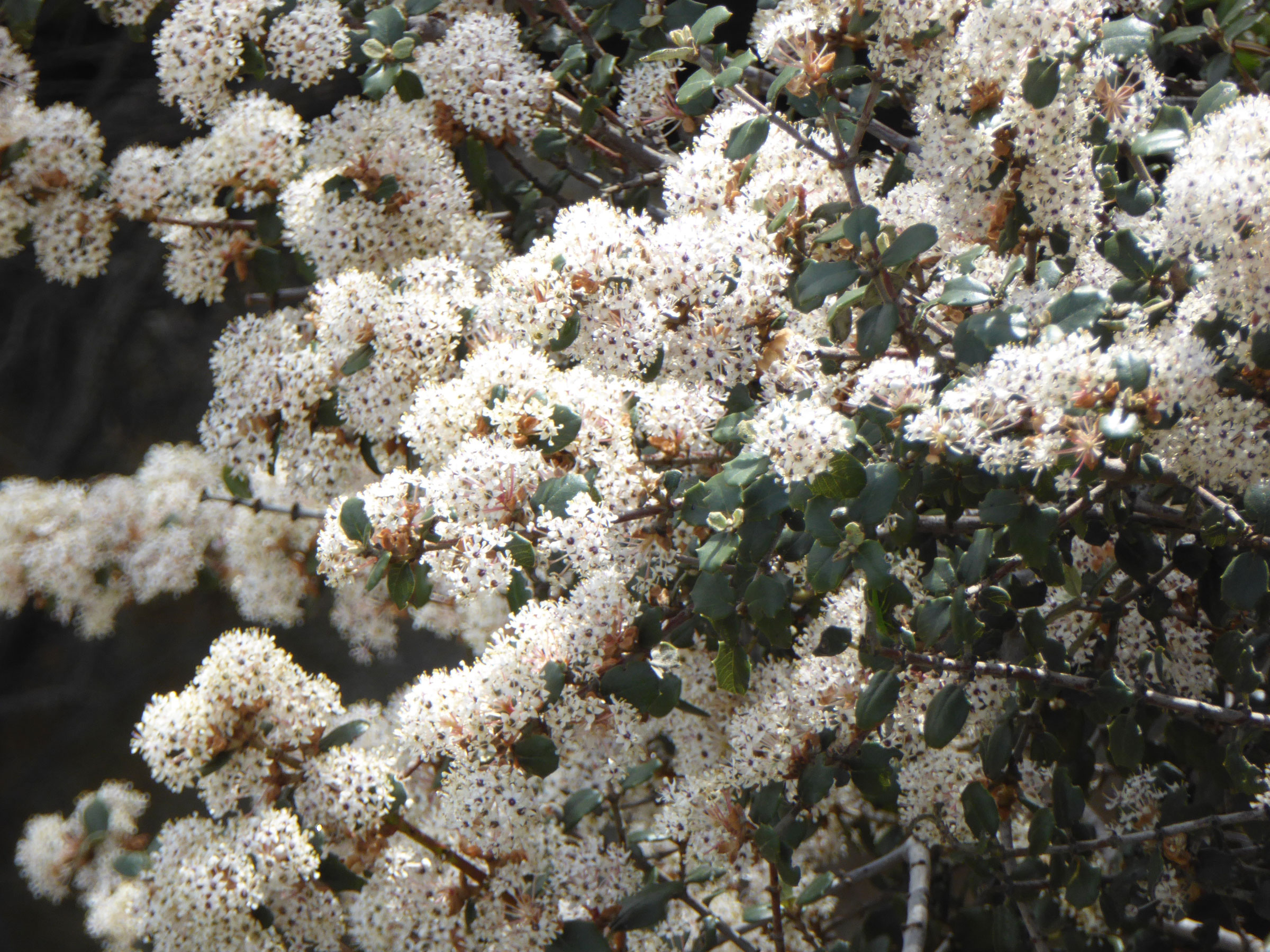 Blooming early and in abundance, ceanothus is an important nectar plant for native pollinators, including wild bees and a host of butterflies. This is buckbrush, Ceanothus cuneatus, which thrives farther inland than big pod ceanothus, but also has flowers that resemble snow.