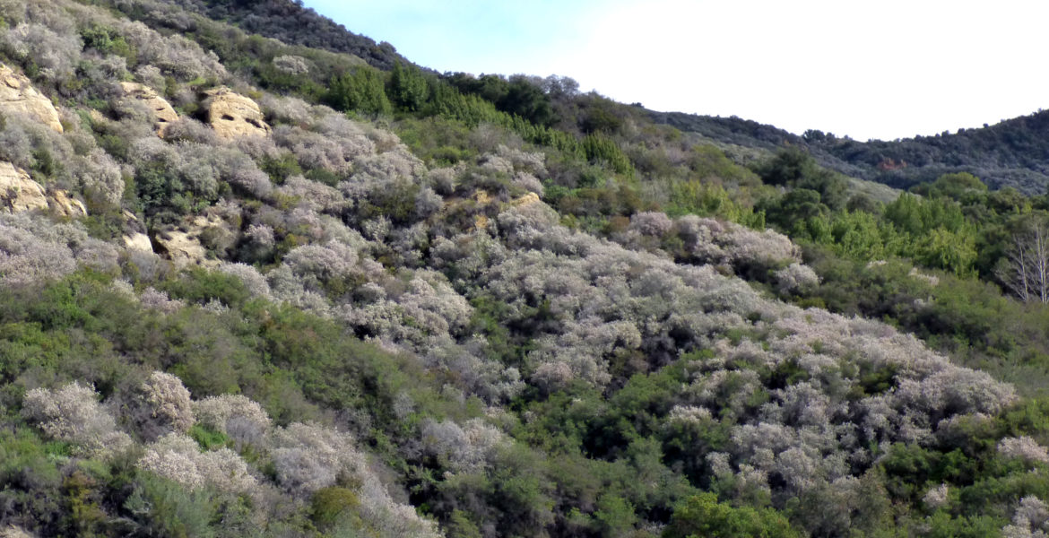 Big pod ceanothus is the dominant ceanothus currently in bloom throughout the Santa Monica Mountains. In Topanga, it forms a dusting of white “snow” on the ridges and canyonsides. Photo by Suzanne Guldimann.