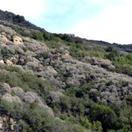 In the Woolsey Fire burn zone much of the ceanothus habitat burned, but surviving patches are in full bloom, and new plants will sprout from seeds that require the heat of the fire to germinate. This is big pod ceanothus, the same species that thrives in Topanga.