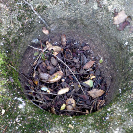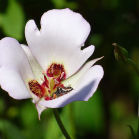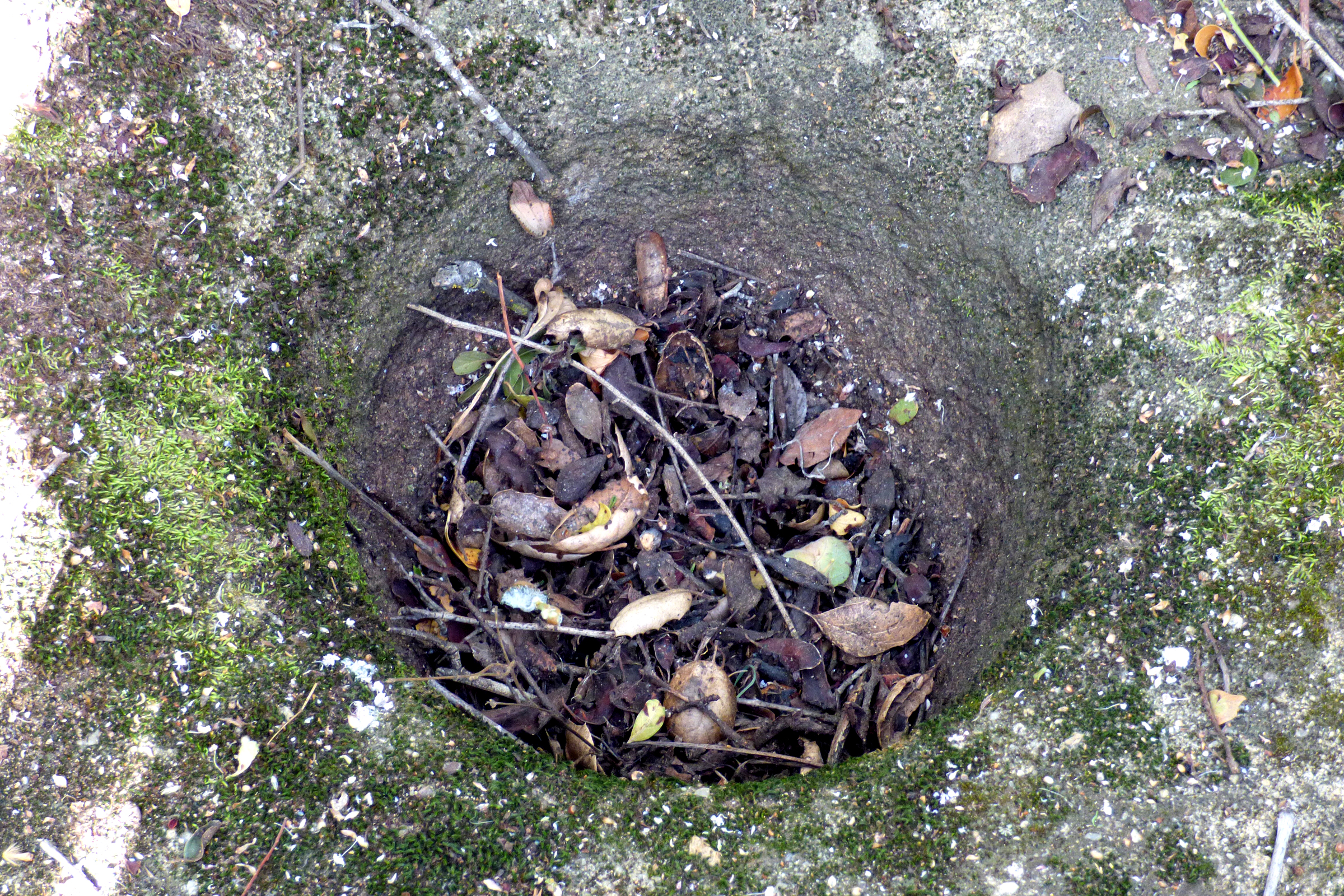 From the meadow, we trod along an oak woodland trail, avoiding poison oak vines that threatened bare ankles or cheeks that unwittingly brushed by. Pushing through undergrowth, Wallace cleared a path to the bedrock mortar, a large stone, now covered in moss and lichen, and its two grinding holes, once used by the Indians who camped there, now filled with debris from towering oak trees.