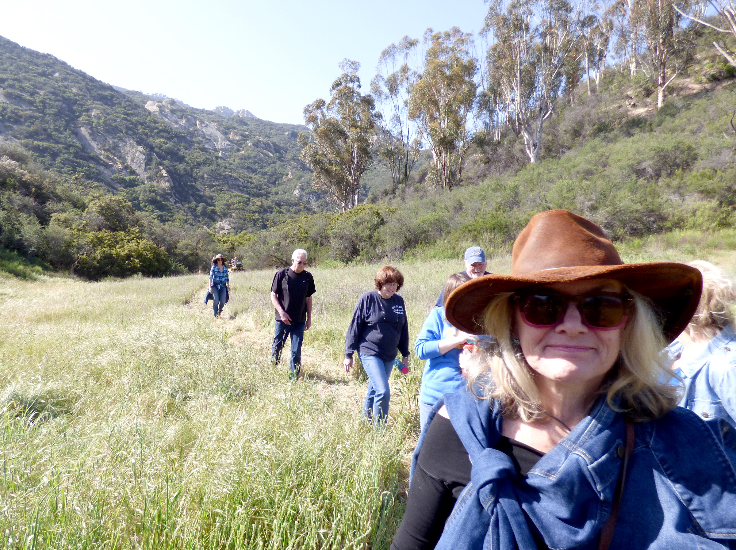 Disembarking from the cart, he led the party up a rocky trail to a small cave, which, he explained, the Ventureno Chumash Indians used as shelter and a 360-degree lookout to the mountains beyond and a valley meadow below sprinkled with tiny lupine. Later, larger versions of lupine, such as we see along roadsides this time of year, appeared and, further on, the showy bush lupine.