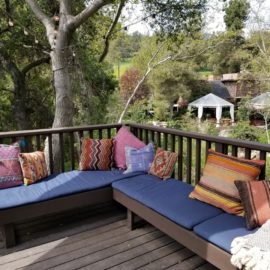 Outside on the shady patio, gorgeous throw pillows imported from Morocco, Turkey, and India offer a decorator’s dream.