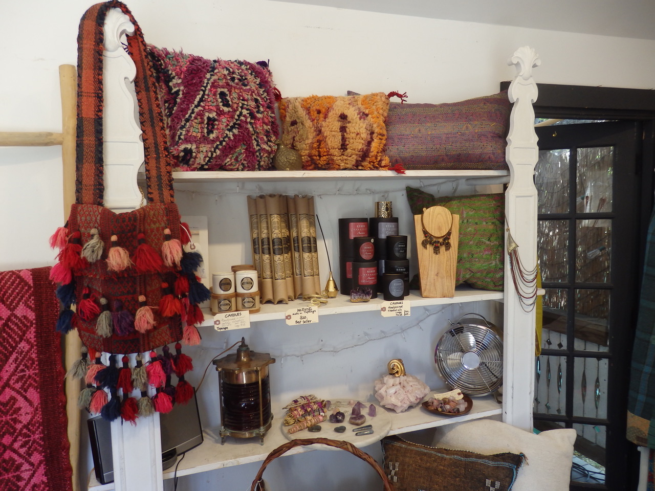 Walking into the shop, one can immediately understand what she means. In one corner are gorgeous one-of-a-kind pillows from Morocco, a vintage Turkish rug, artisan jewelry, handmade candles, imported incense, wood-carved bookends, or that perfect gift.
