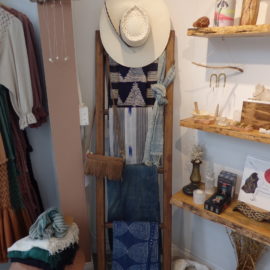 In the middle of the shop are sustainably sourced teas by OneTea and The Forest Said clothing. On a rack near the front door are Monica’s ethereal dresses by Moona Star Clothing Organic linen and lace, whose clothing line is inspired by the desert and the skies.