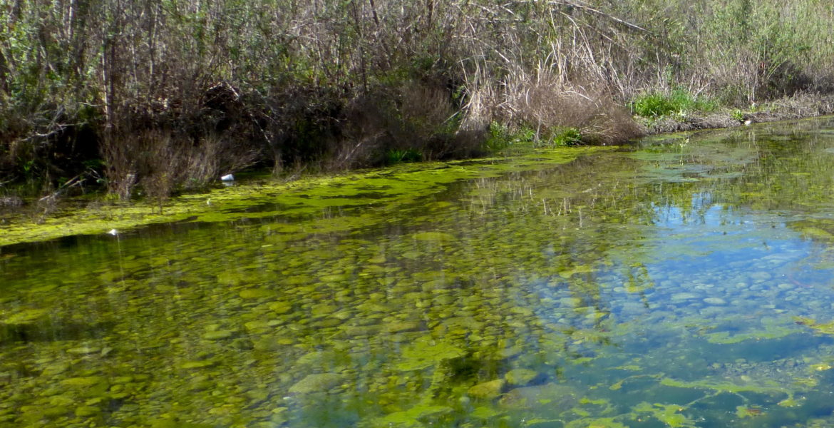 This lush green local creek still has water in it in August this year, but it is also full of potentially toxic algae. It’s a good idea to keep dogs—and children—away, no matter how tempting the water looks.