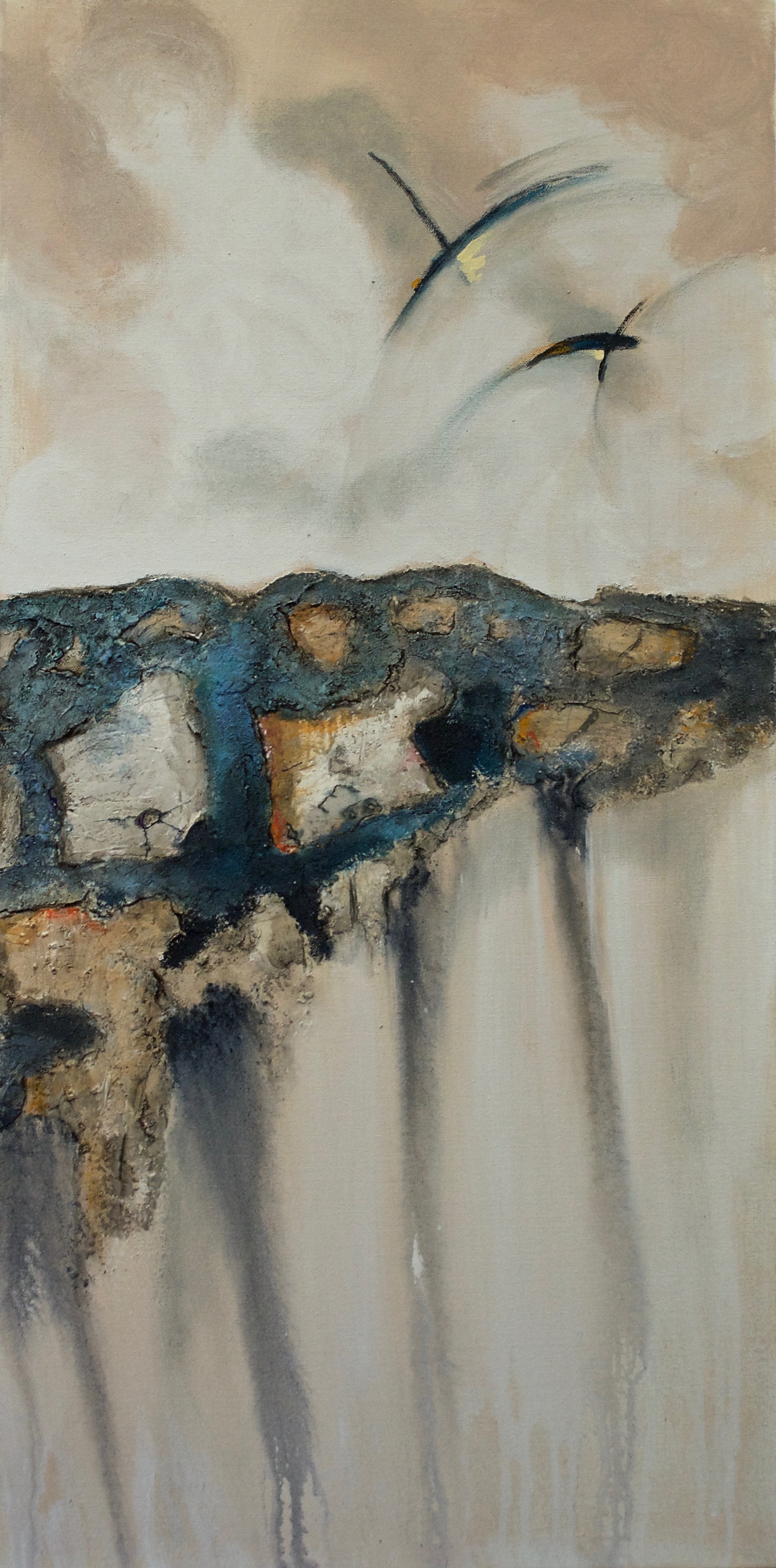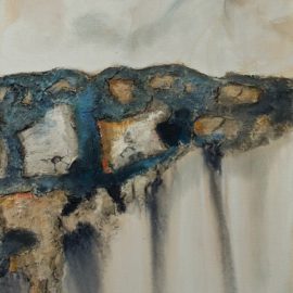 Her paintings for this series are acrylic, mixed media, which includes textured mediums, different types of water-based paints, with the addition of inks, charcoal pencil, pastels, or an undercoating of leafing (gold or silver). This body of work is painted on canvas or wood panels. She is also showing some assemblages created with paint, paper, texture mediums, found objects, both man-made as well as naturally occurring elements.