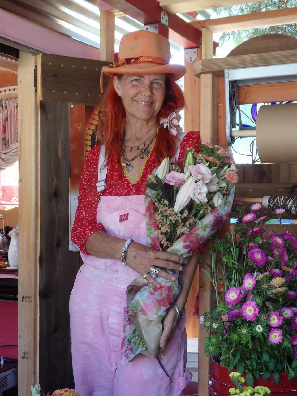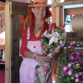 A handmade Lilliputian fairy garden surrounds the shop. Always cheerful and full of love, Gidget displays her wares throughout the week and graces weddings, parties, and concerts with her beautiful flower creations on the weekends.