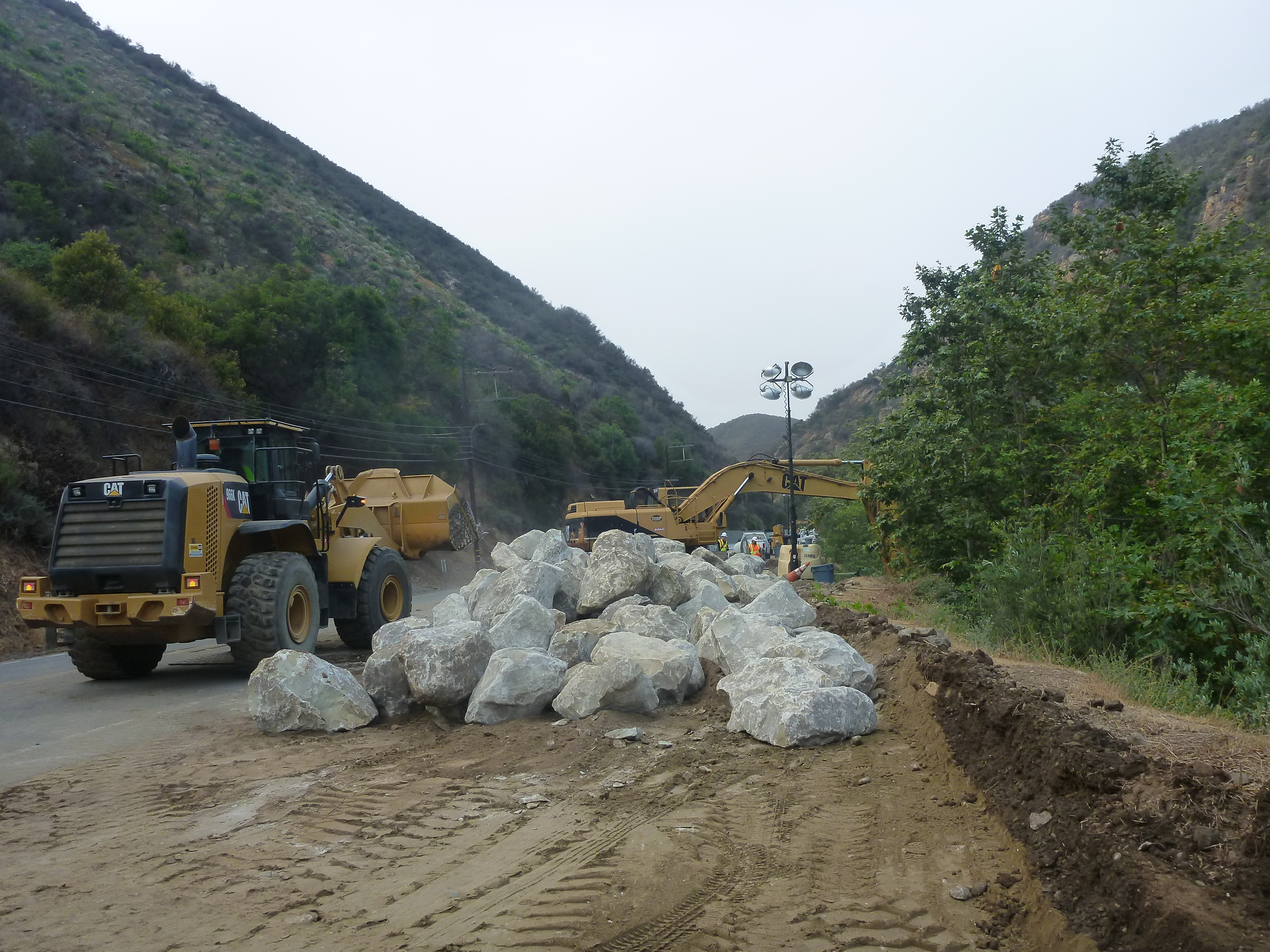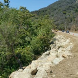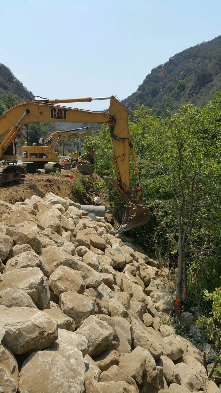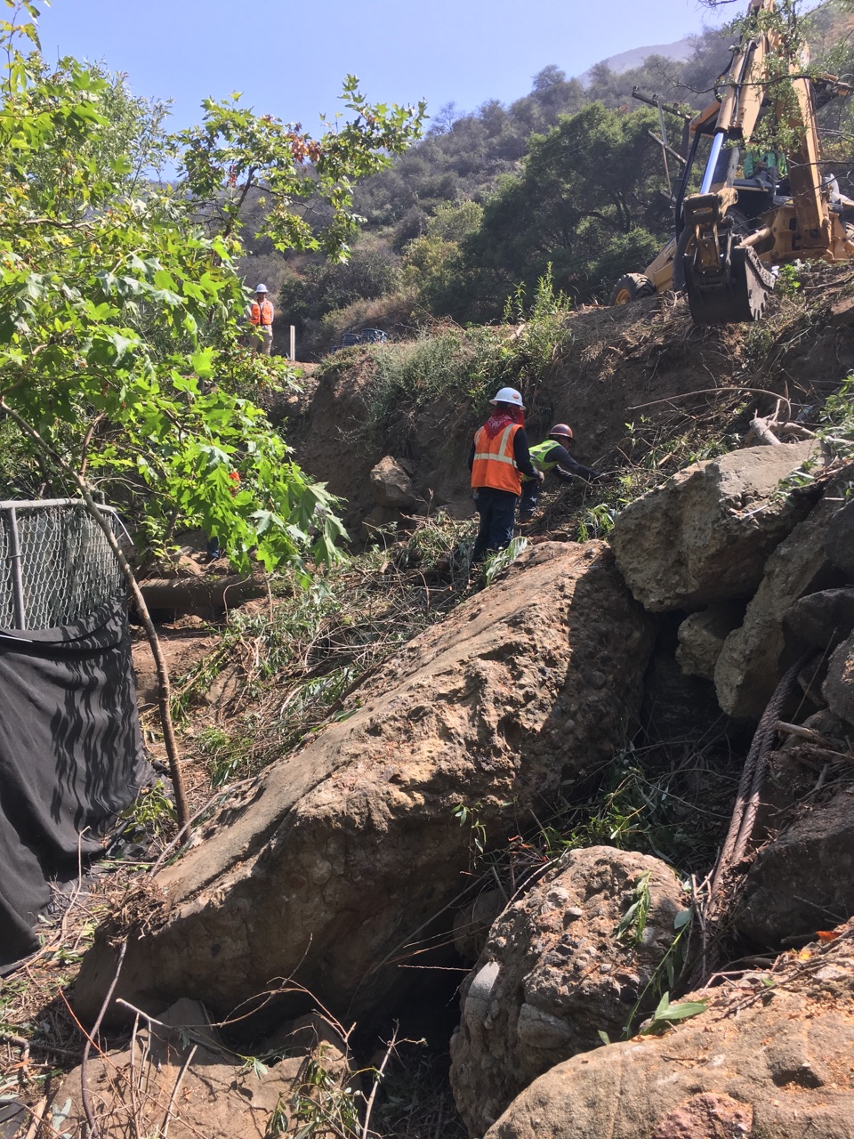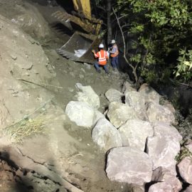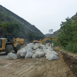 Responding to January’s fire in the area, heavy rainfall in February, and mudslides in March, Caltrans engineers, spearheaded by Sr. Construction Engineer Michael Dipsia, the contractor, Union Engineering, with biologists on hand, set about restoring the creek that had been severely impacted by the mudslide