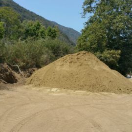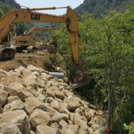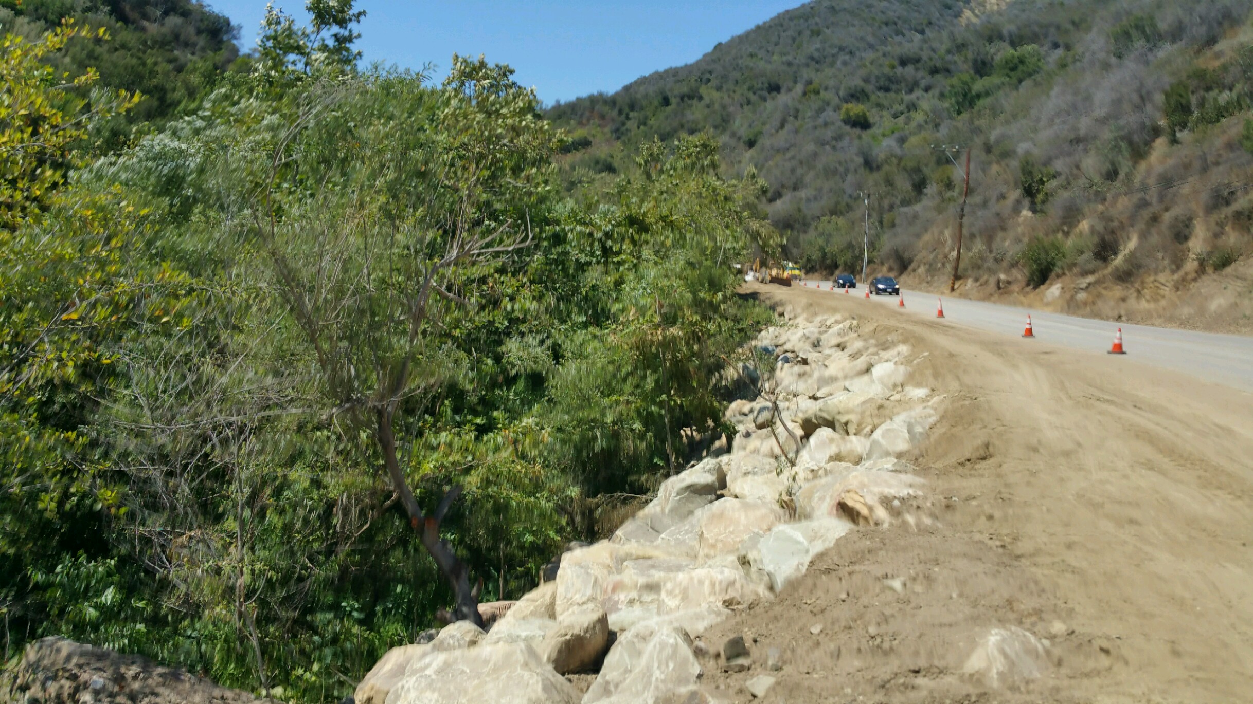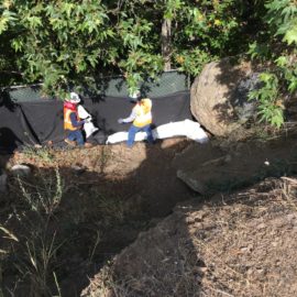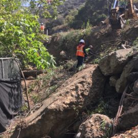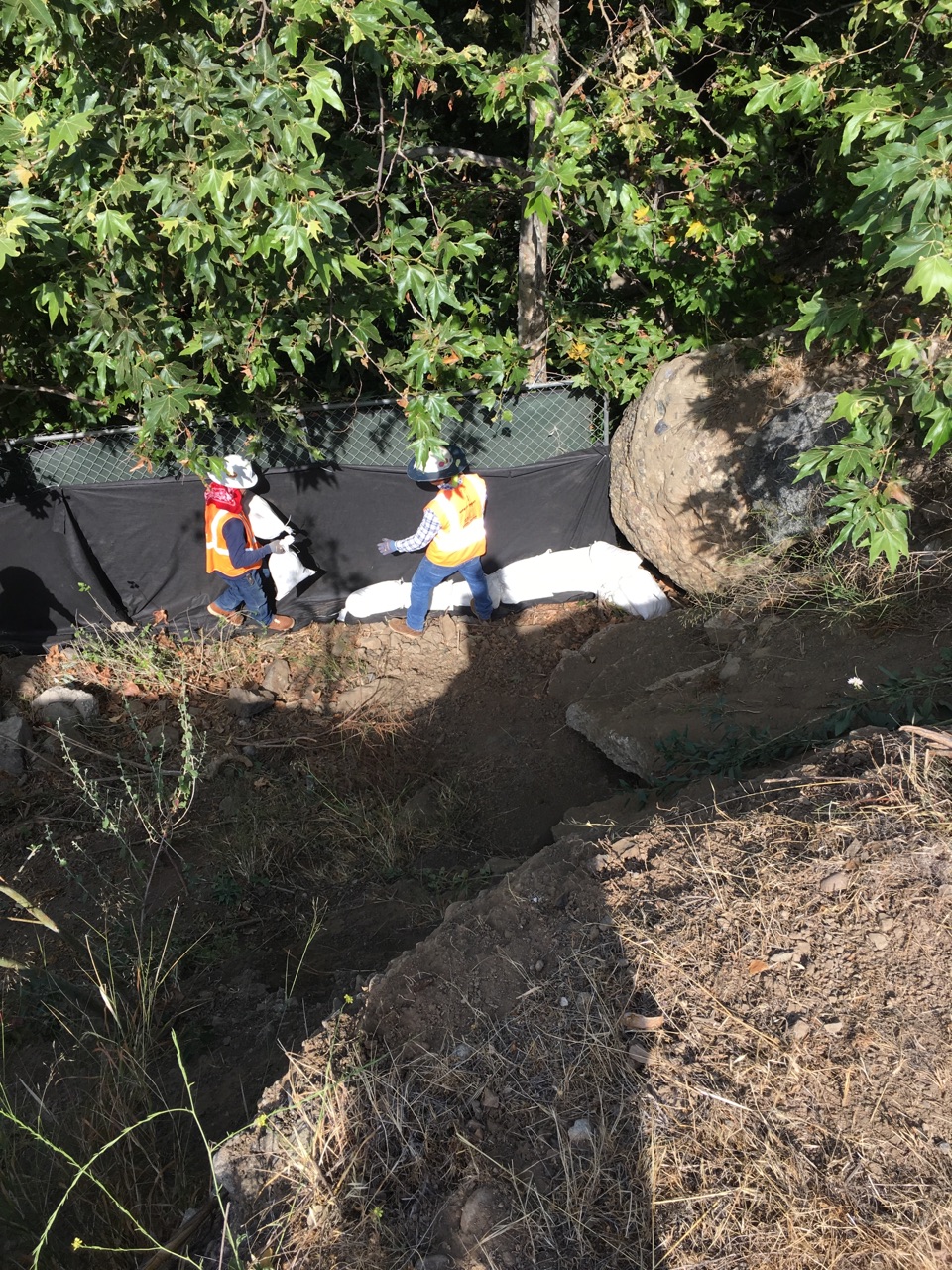 Caltrans biologists, in collaboration with Rosi Dagit, laid a survey line that identified the project limits along the perimeter of the creekbed where fencing was installed, then layered with silt cloth and secured with bags of gravel at the fence line. Trees and bushes were removed to make way for the boulders and cuttings from willow trees were saved and planted in the soil among the boulders along with seeds harvested from native shrubs and bushes that, once established, will prevent erosion of the bank.