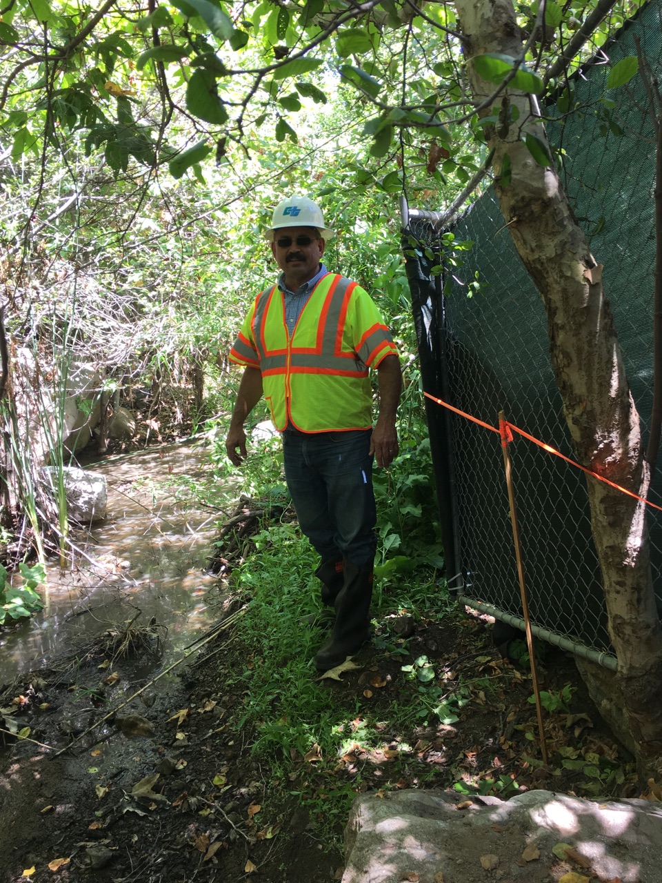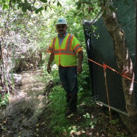 Mike Dipsia in the creek where a survey line (orange tape) identified the project limits along the perimeter of the creekbed where fencing was installed. Fences were layered with silt cloth, then bags of gravel placed at the fence line to protect the creek from accidental debris contamination from the work area. Photo by Michal Dipsia