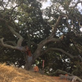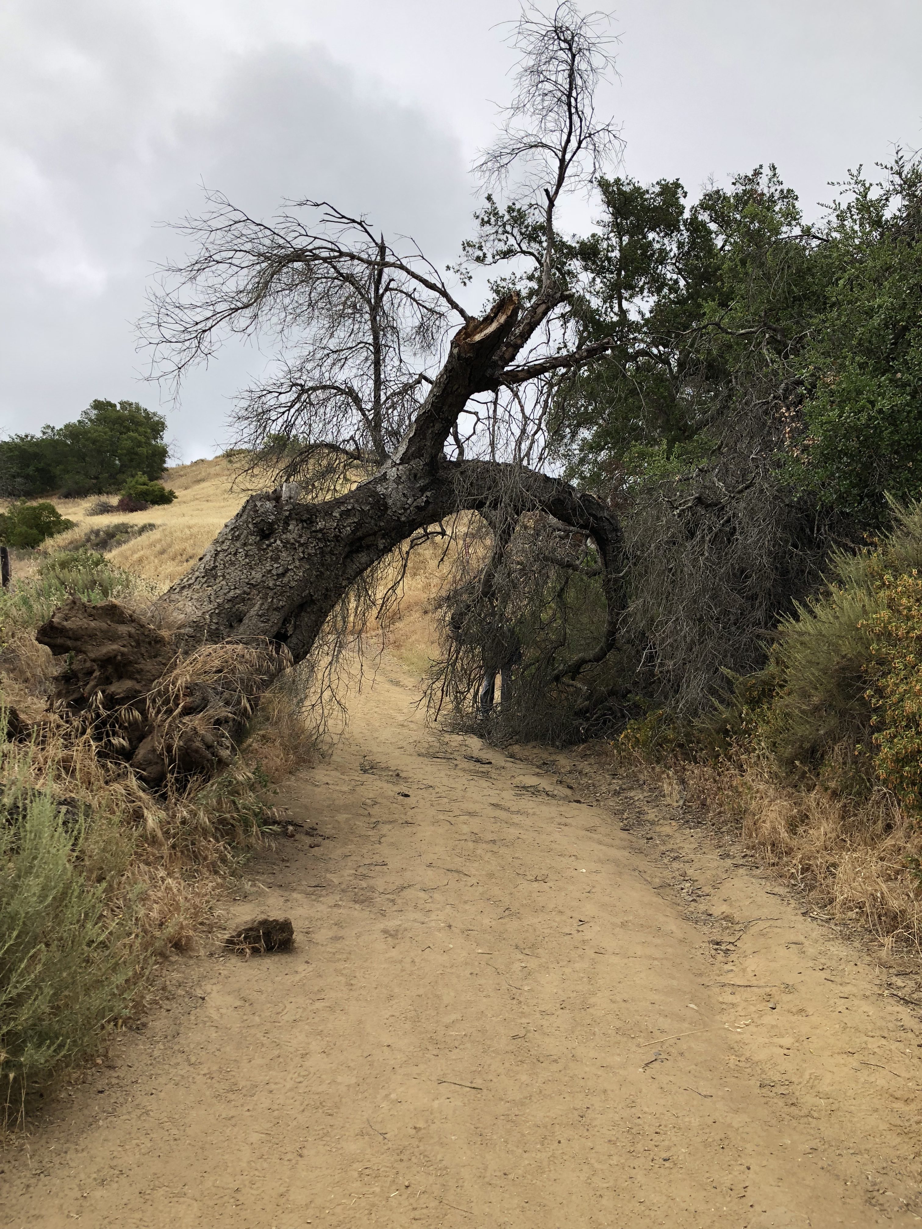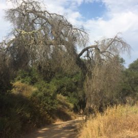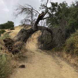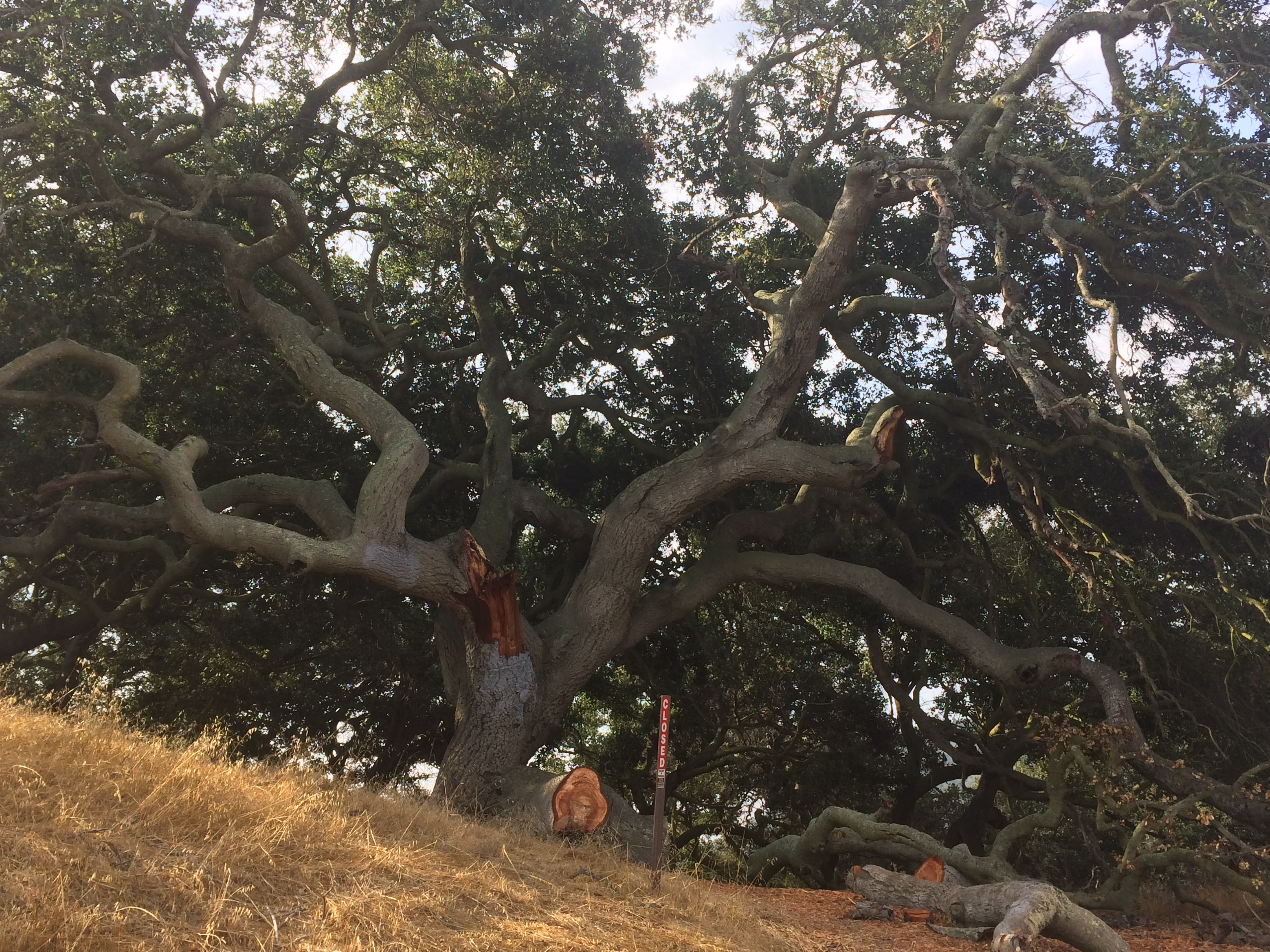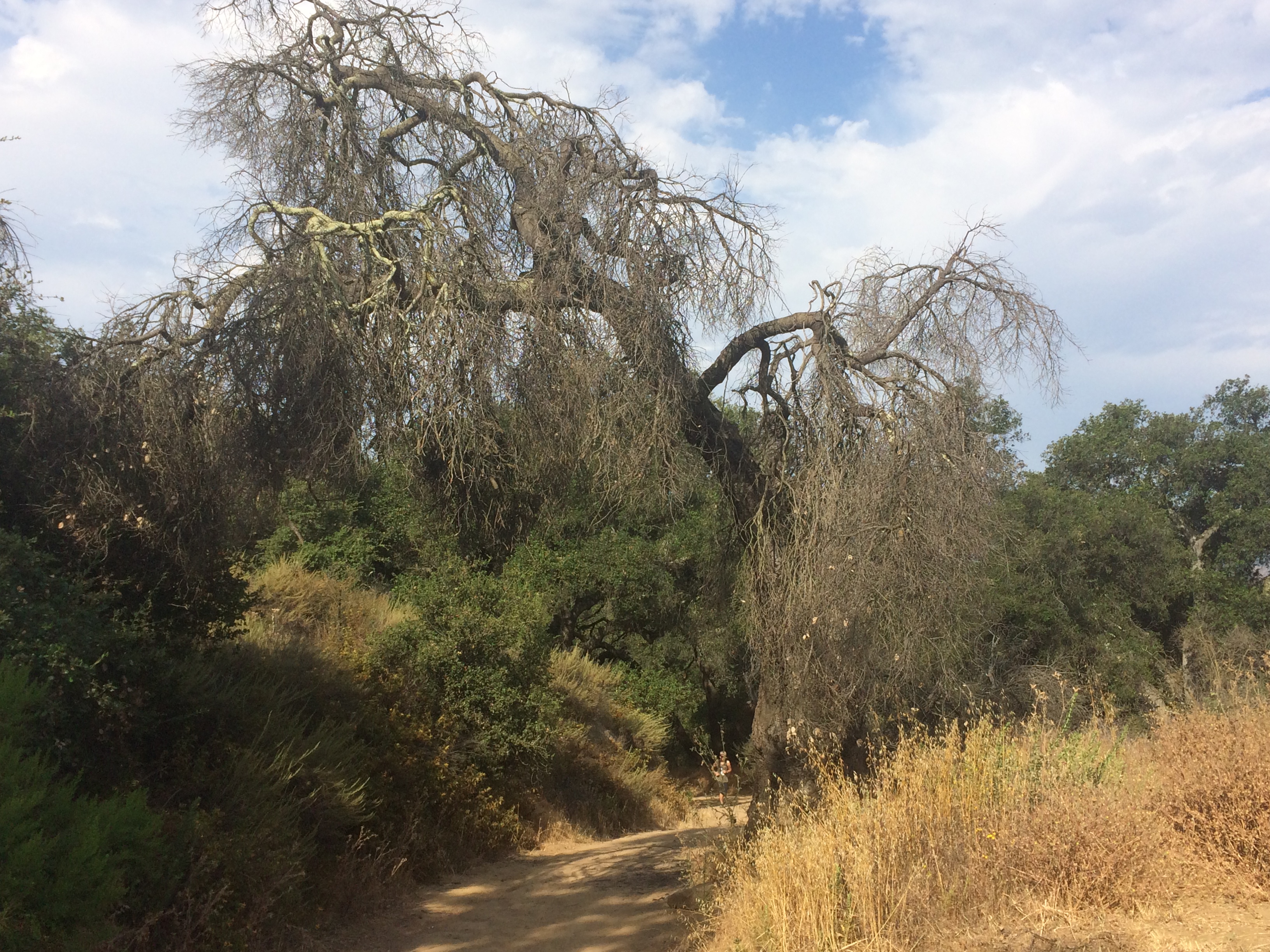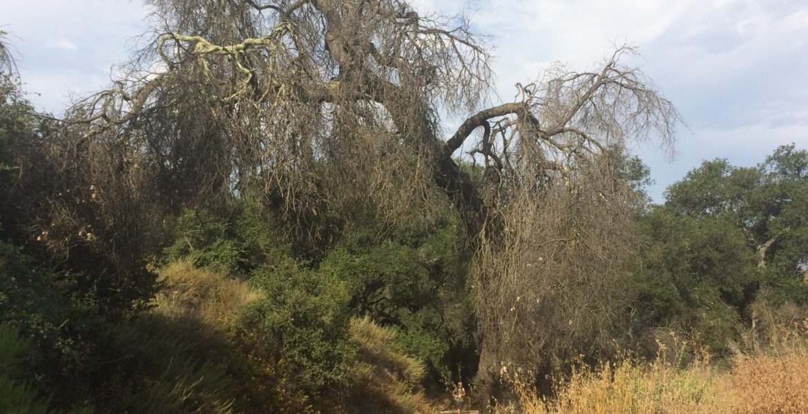 After spreading her branches to provide perches for generations of scrub jays, ravens, owls, and hummingbirds, Grandmother Oak finally succumbed to the drought and died in January 2016. But she was still so strong that it took almost two more years, until July 2018, for her sturdy trunk to give way and collapse. Many a tear was shed by those who visited this venerable tree that stood sentinel along the fire road in Topanga State Park for more than 300 years.