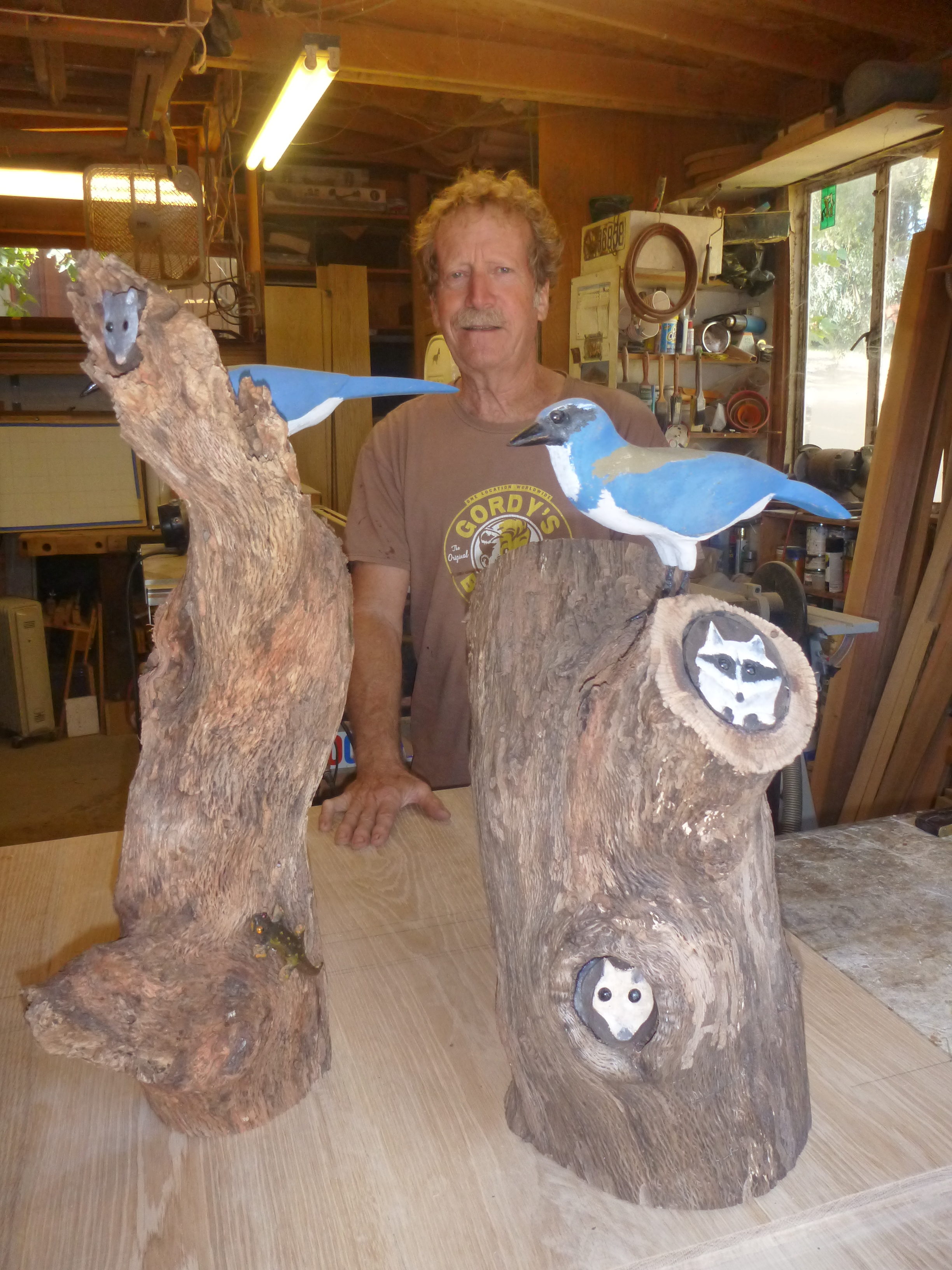 Thanks to the help of local master woodworker Tom “Teeg” Merchant, Grandmother Oak lives on! Two of her branches were salvaged, and the outer bark removed, revealing the intricate web of xylem cells that used to carry water and nutrients throughout the tree. Teeg hollowed out the branch ends, and hand-carved small creatures to fill the cavities. Much as she did when she was alive, these small Grandmother Oak “tree houses” continue to shelter an owl, raccoon, squirrel and provide a perch for a scrub jay, all hand-carved and painted with love by Teeg. He even managed to hand carve a small ensantina, an elusive nocturnal salamander that lives only in oak trees.