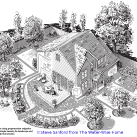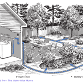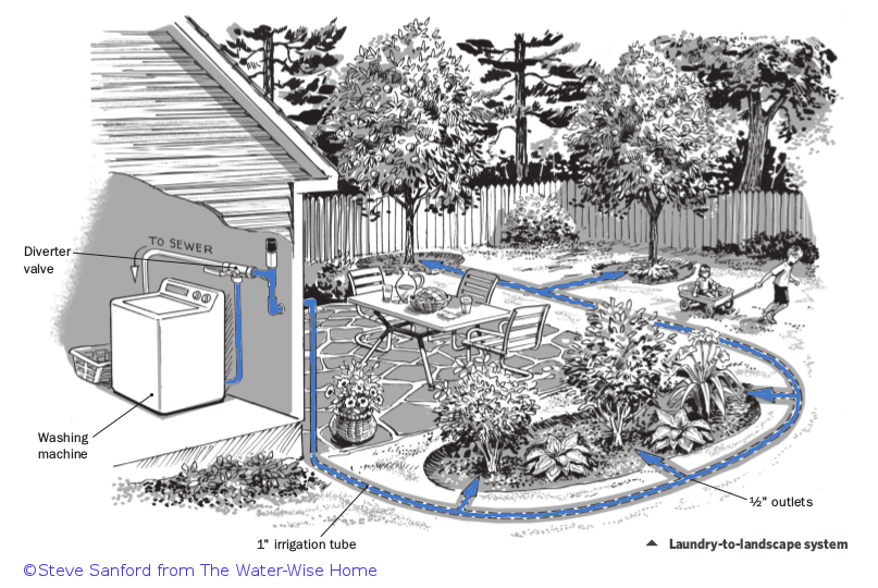 Laundry to Landscape—These are the easiest to set up as there is no requirement for a permit and they are quite flexible during installation. They work by using the washing machine’s pump to push water to the landscape. There are limitations to this as the small pumps can’t push uphill and shouldn’t go much farther than 50 feet, unless going down slope. Materials include PVC pipes, PolyEthelene tubing, and a diverter valve to choose whether to send water towards the landscape or to the septic system.