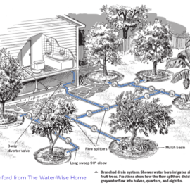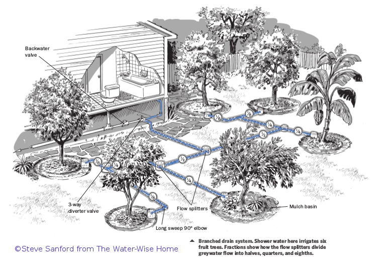 Branched Drain—This system does need a permit because it involves cutting into the existing plumbing to separate and redirect greywater to the landscape. Also, the plants to be watered must be downslope from the greywater source as these drains rely solely on gravity. As the name implies, this design works by progressively splitting the pipes in two to form a branched shape. Materials used are ABS rigid pipe, a diverter valve and ideally an actuator (electric motor) mounted on the diverter to remotely switch valve positions. Usually, the valves are in crawl spaces so you don’t want to go there to switch it before a shower.