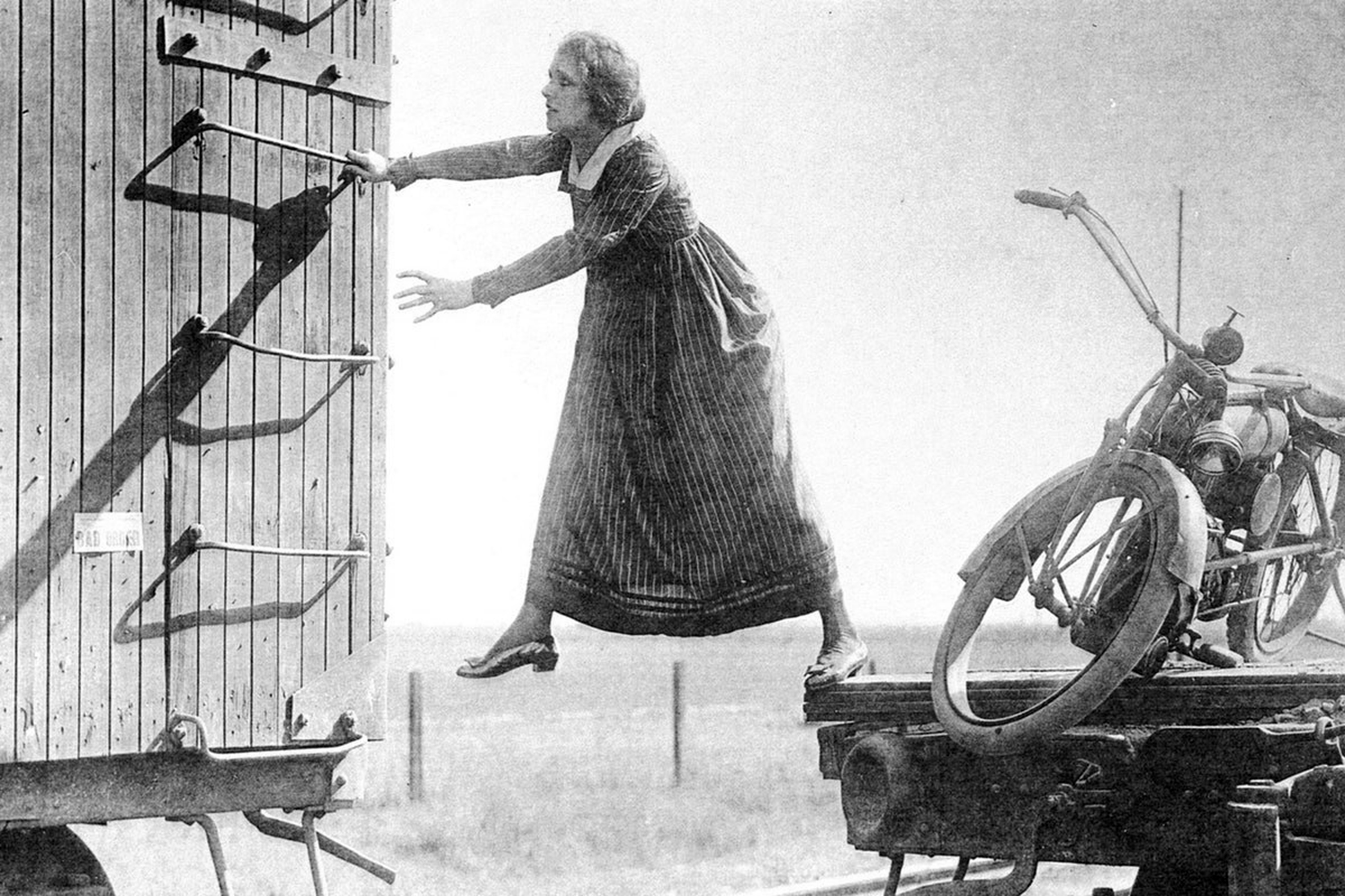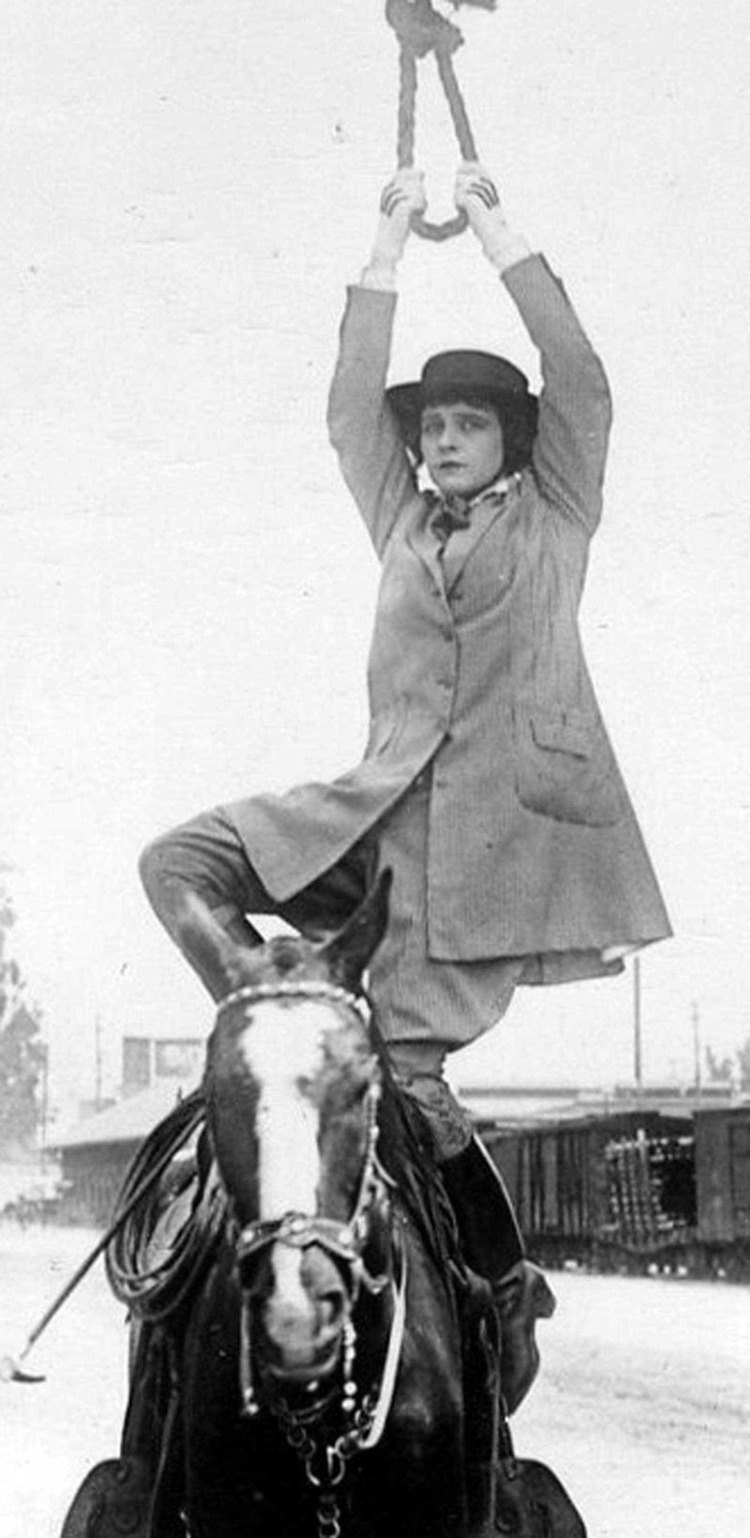 Gibson’s biggest role was in The Hazards of Helen (1914-1917), the longest serial in history with 119 episodes. She played a telegraph operator who turned into a kind of superwoman when problems arose, saving the day with incredible stunts like jumping onto moving trains, racing motorcycles, and standing on galloping horses. The studio re-named her Helen after her character.