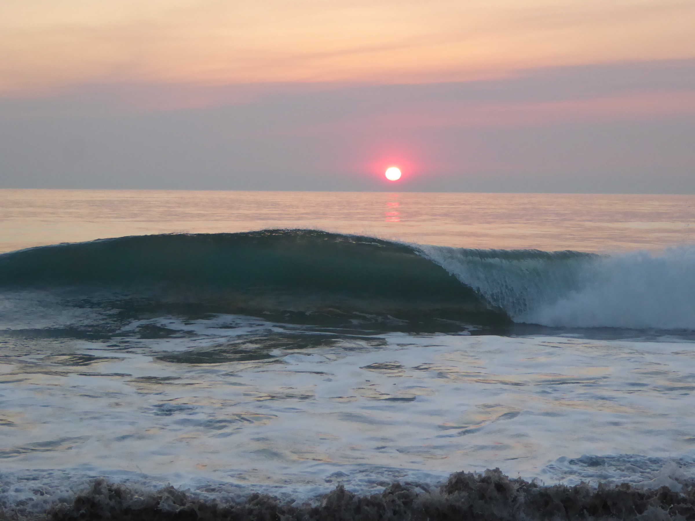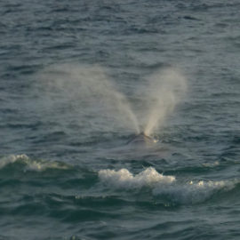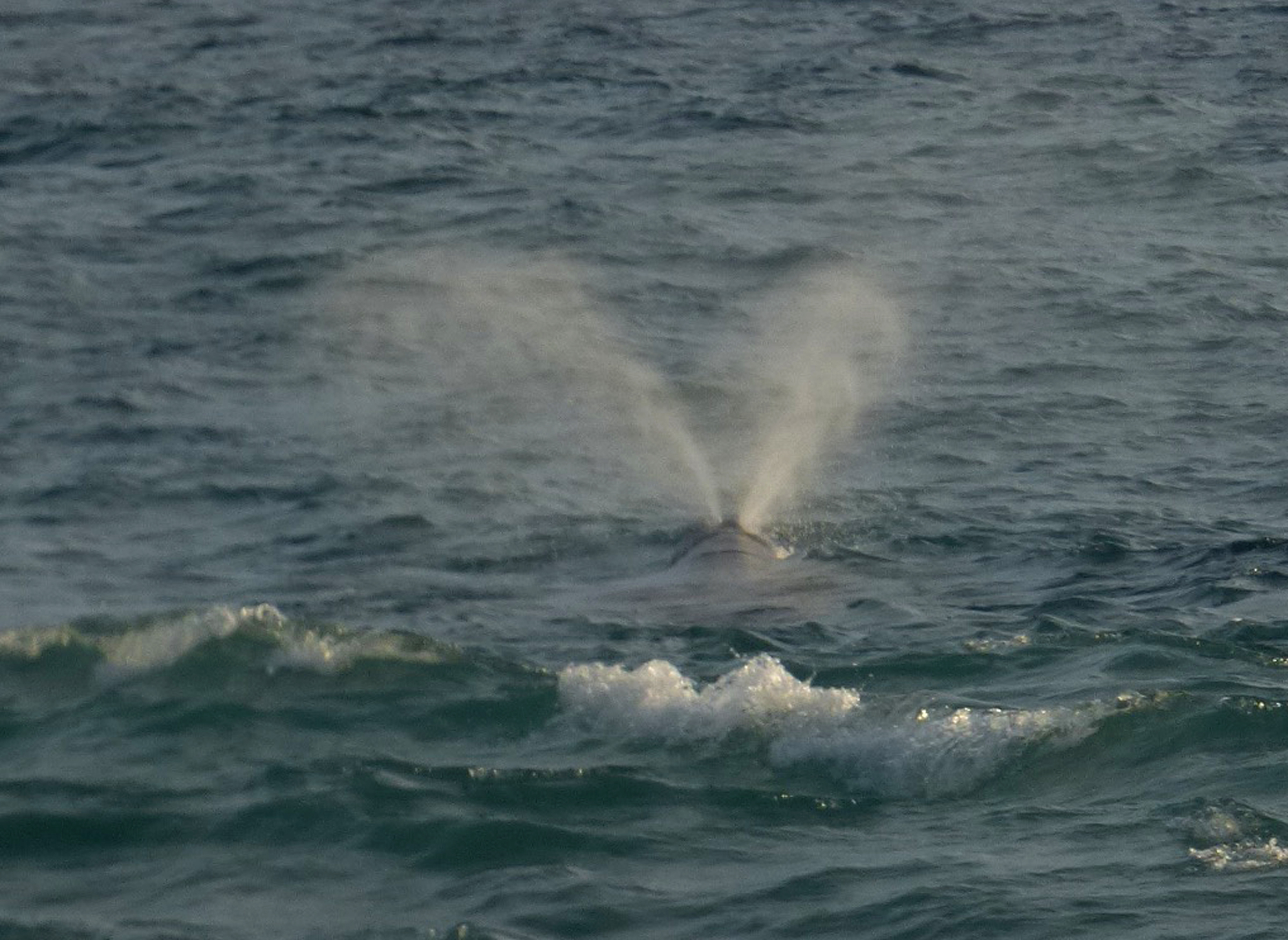 Even a gray evening without a visible sunset has its rewards. Whales and dolphins can be easier to spot during gray weather, especially when the sea is calm and there are no wind waves. On a still, foggy day gray whales can sometimes be heard breathing before the observer actually spots them in the water. On a stormy day watching the big waves and the surfers pursuing them is another unforgettable winter beach experience.