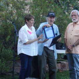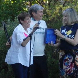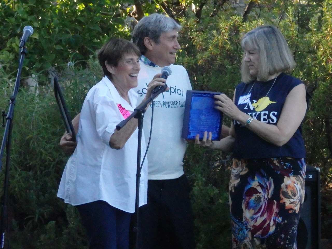 Political activist Harvey Wasserman accepts the "Outside the Party" award from Dorothy Reik, President of the PDSMM and actor and activist Mimi Kennedy.
