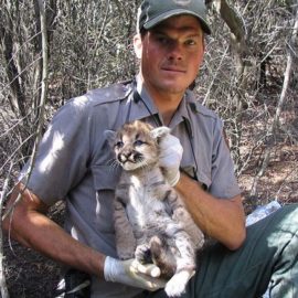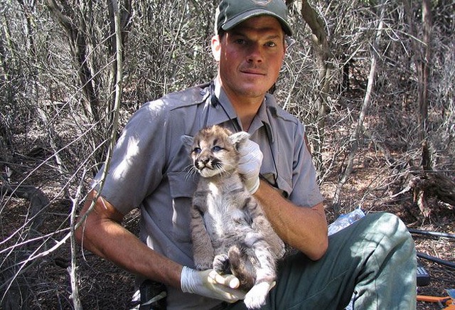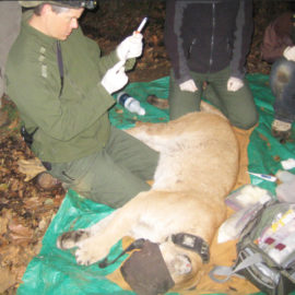 National Park Service biologist, Jeff Sikich examines a tranquilized mountain lion. Photo courtesy of National Park Service
