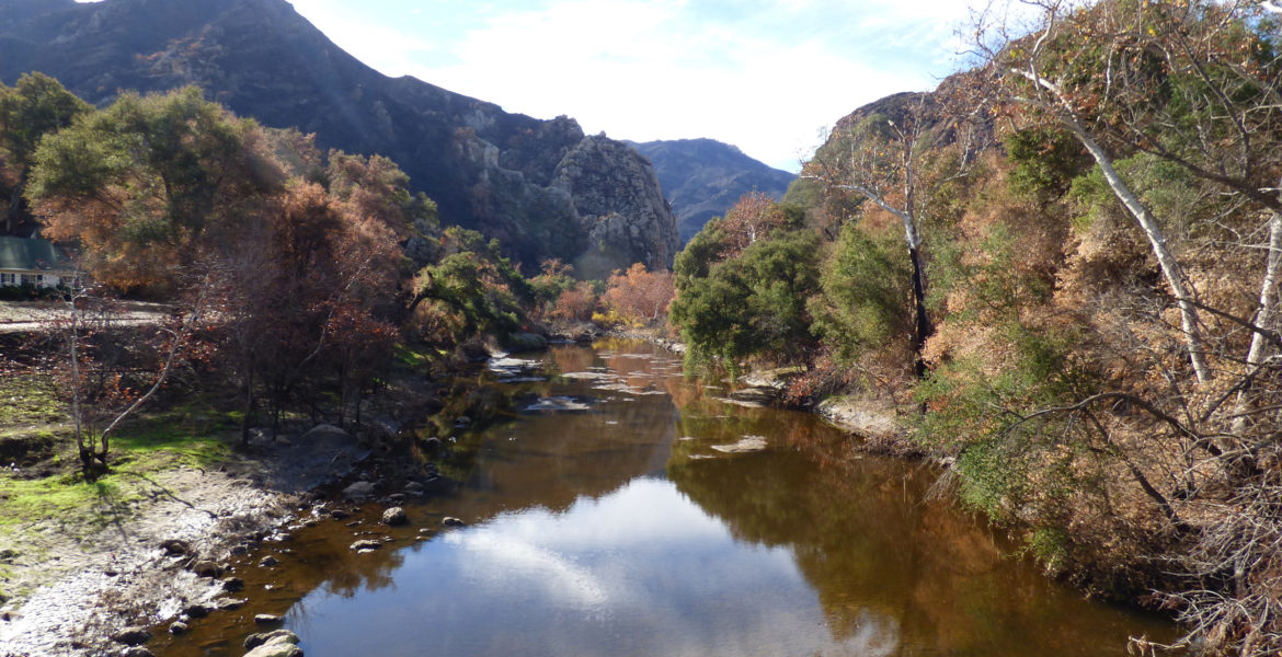 Above, the view from the old bridge looking towards Goat Buttes in the heart of Malibu Creek State Park reveals burned areas but also untouched oak trees. Photo by Suzanne Guldimann