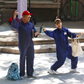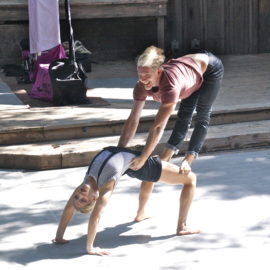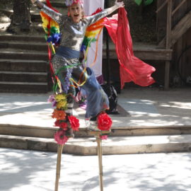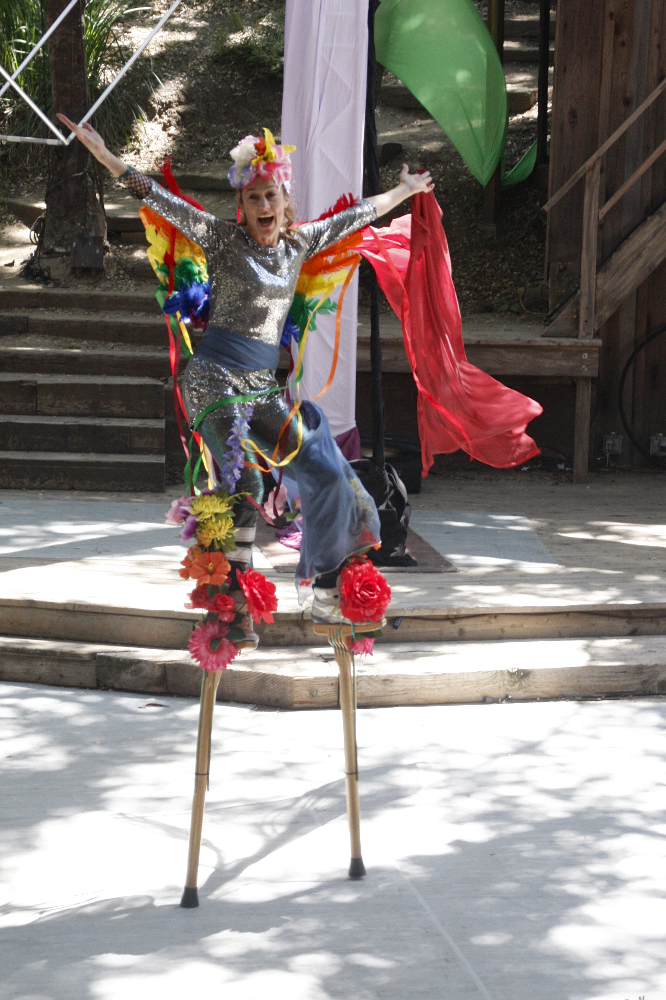 Lexi Pearl, creator of MOMentum Place in honor of her late mother, Karin Woodward, suddenly entered the stage on stilts festooned with feathers and flowers. She welcomed everyone and asked how many of them were attending a Theatricum show for the first time—an astonishing fifty percent raised their hands. As she ran through the program we were about to witness, she made a costume change from stilt-walker to aerialist and introduced the first performers.