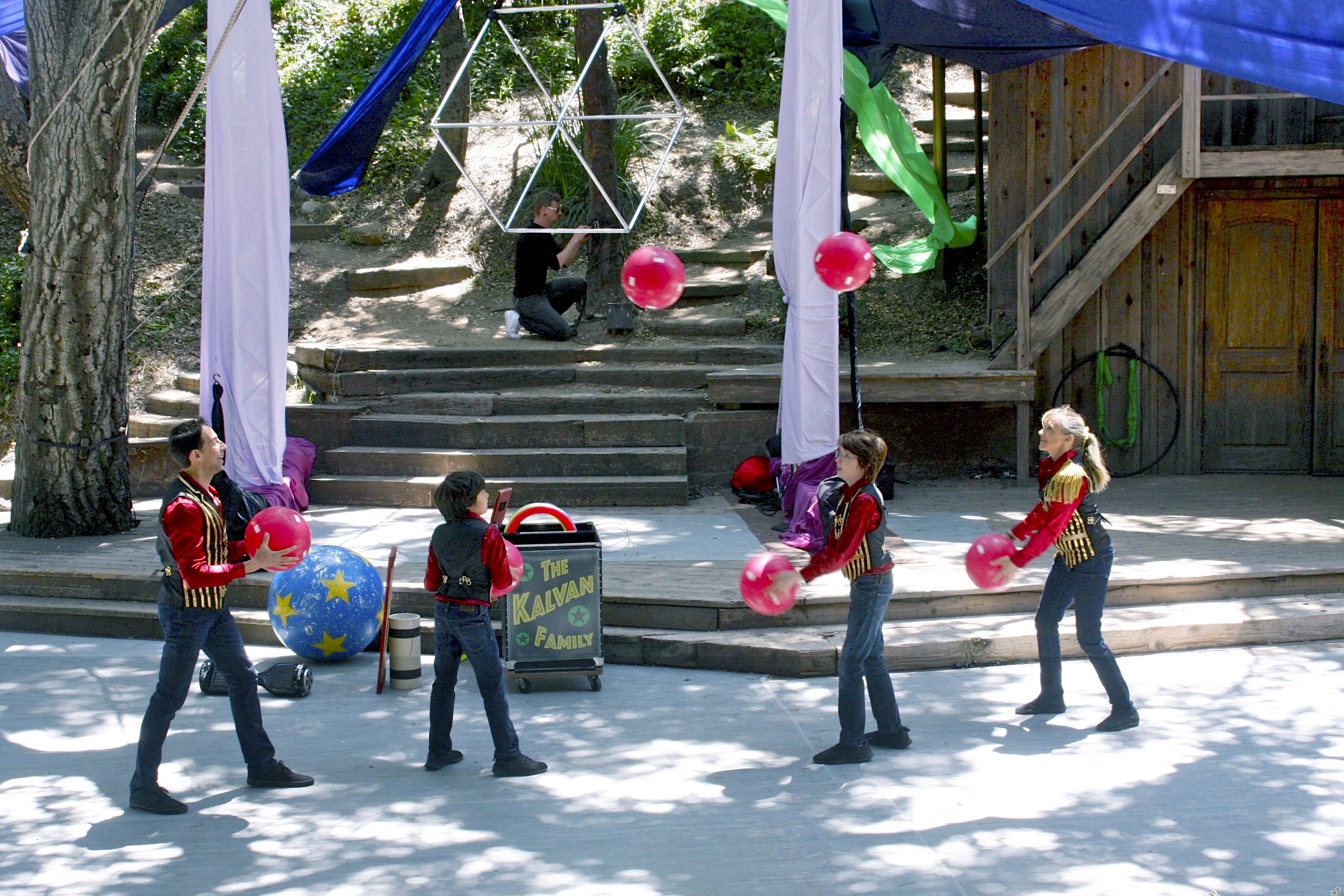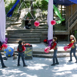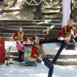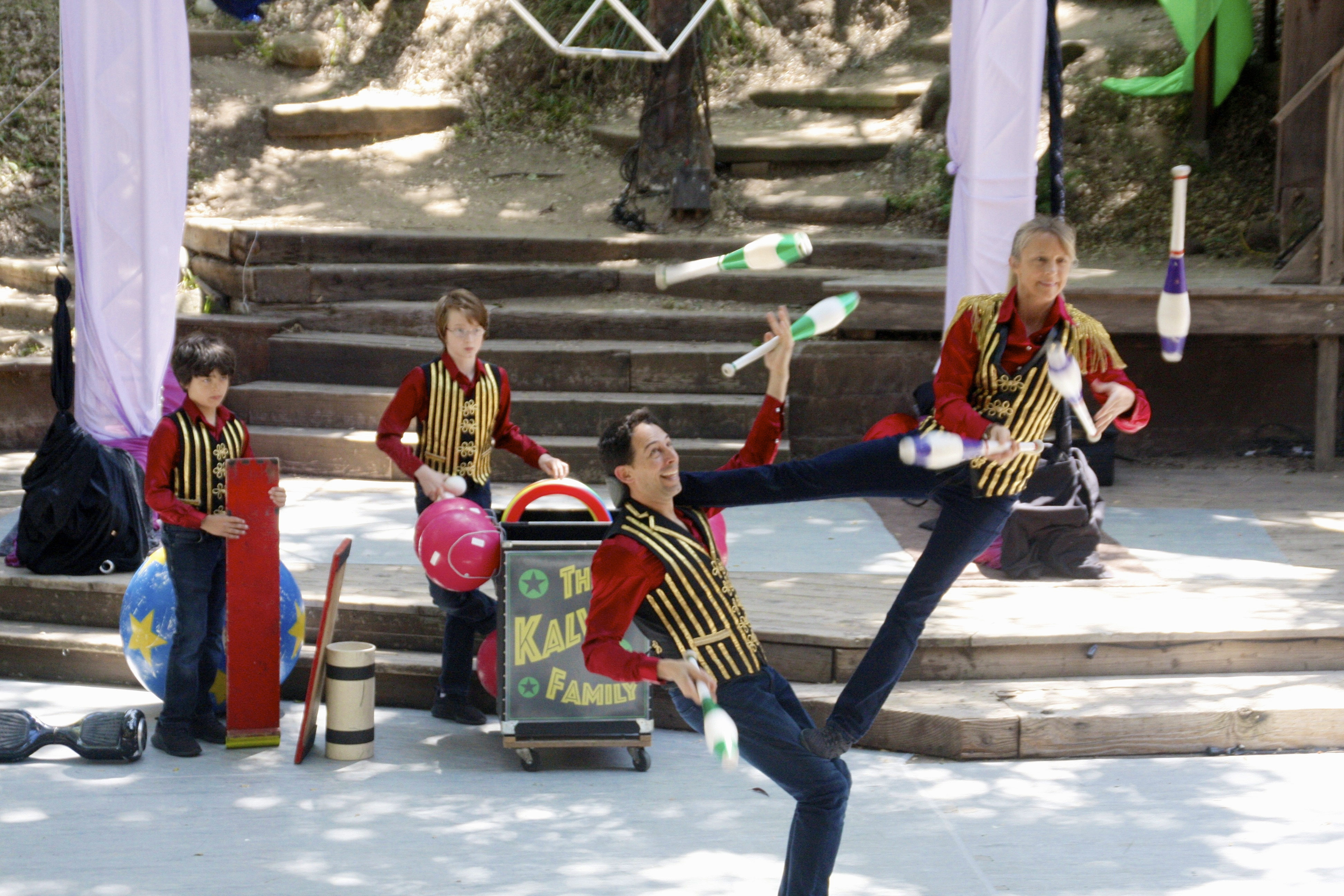 The mainstage show began with the Kalvan Family Circus featuring Jeri and Jack, Max, and Oz Kalvan as they performed amazing feats of juggling. Because the line for the sold-out show was so long, the Kalvans ran through their repertoire and probably invented some new juggling feats. Children were invited to the stage to try some of the balancing tricks themselves until everyone settled in.