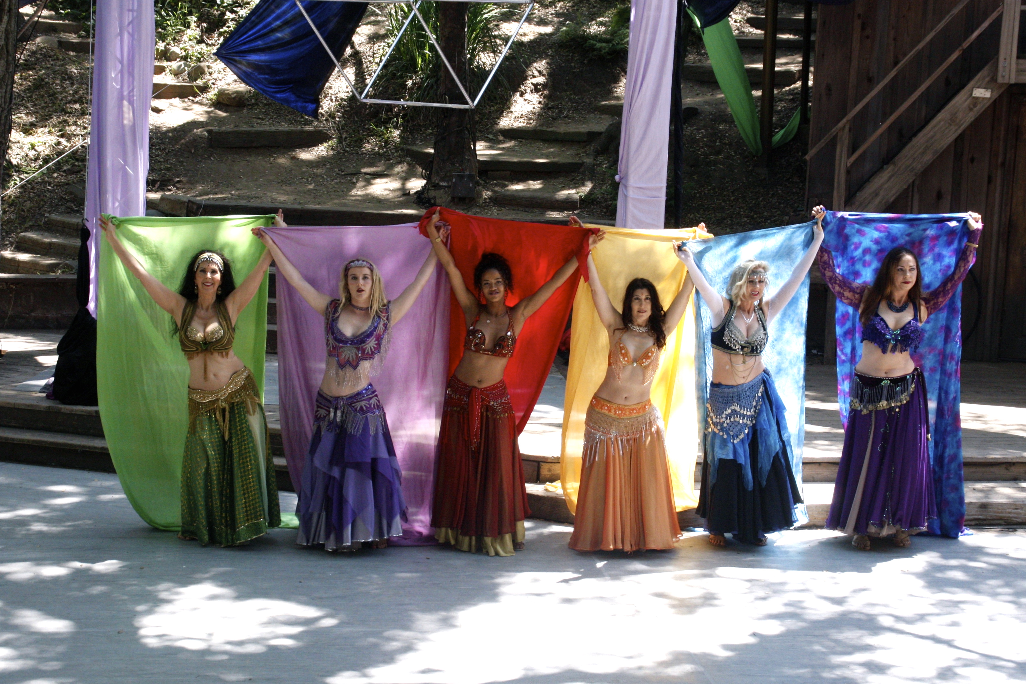 Melanie Kareem and her belly dancing troupe of six beauties—Dawn Marie Yurkovic, Napali Cohen, Diana Mather, Vanessa Frazier, and Rachel Moore—whirled in their bedlah costumes of colorful veils and scarves to create a rainbow in graceful motion.