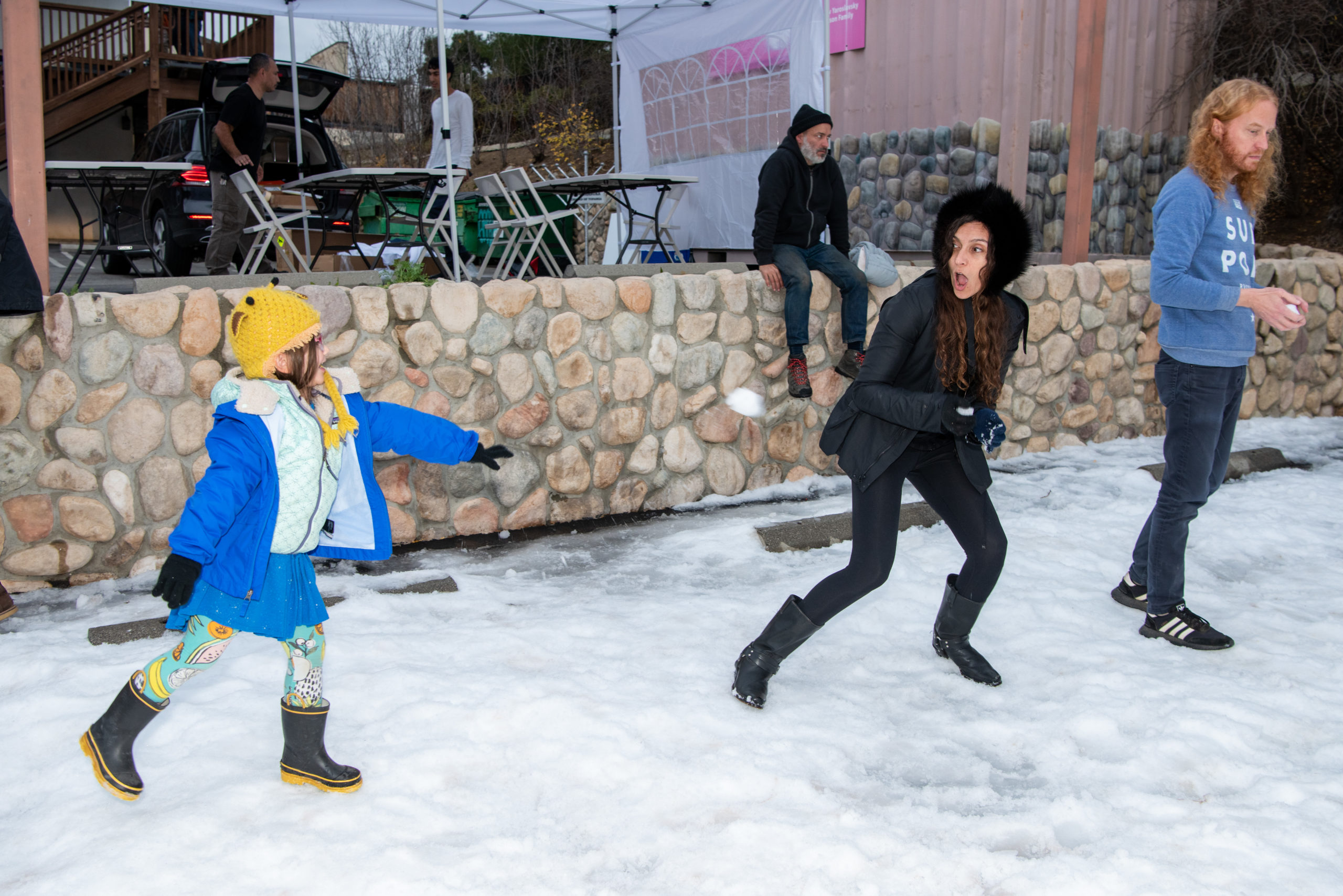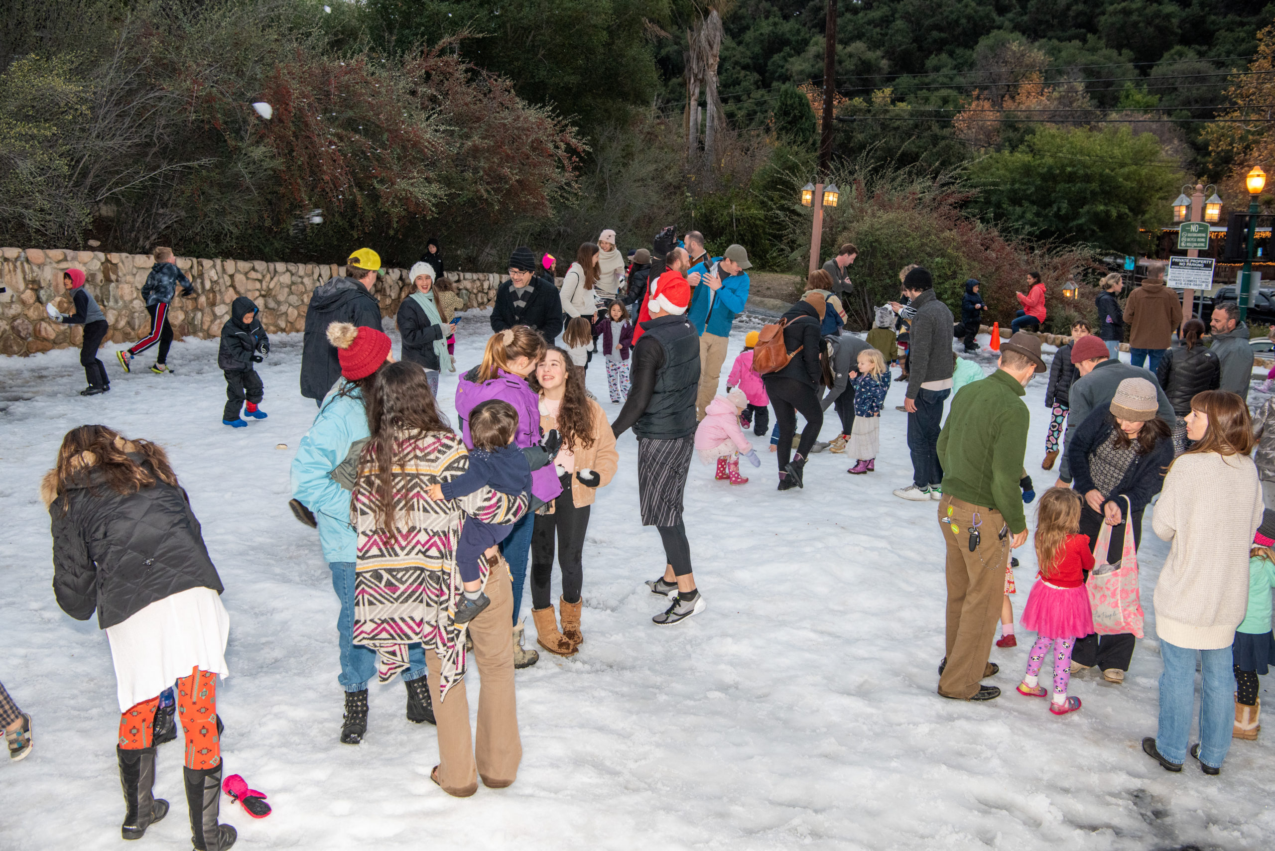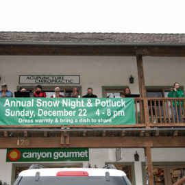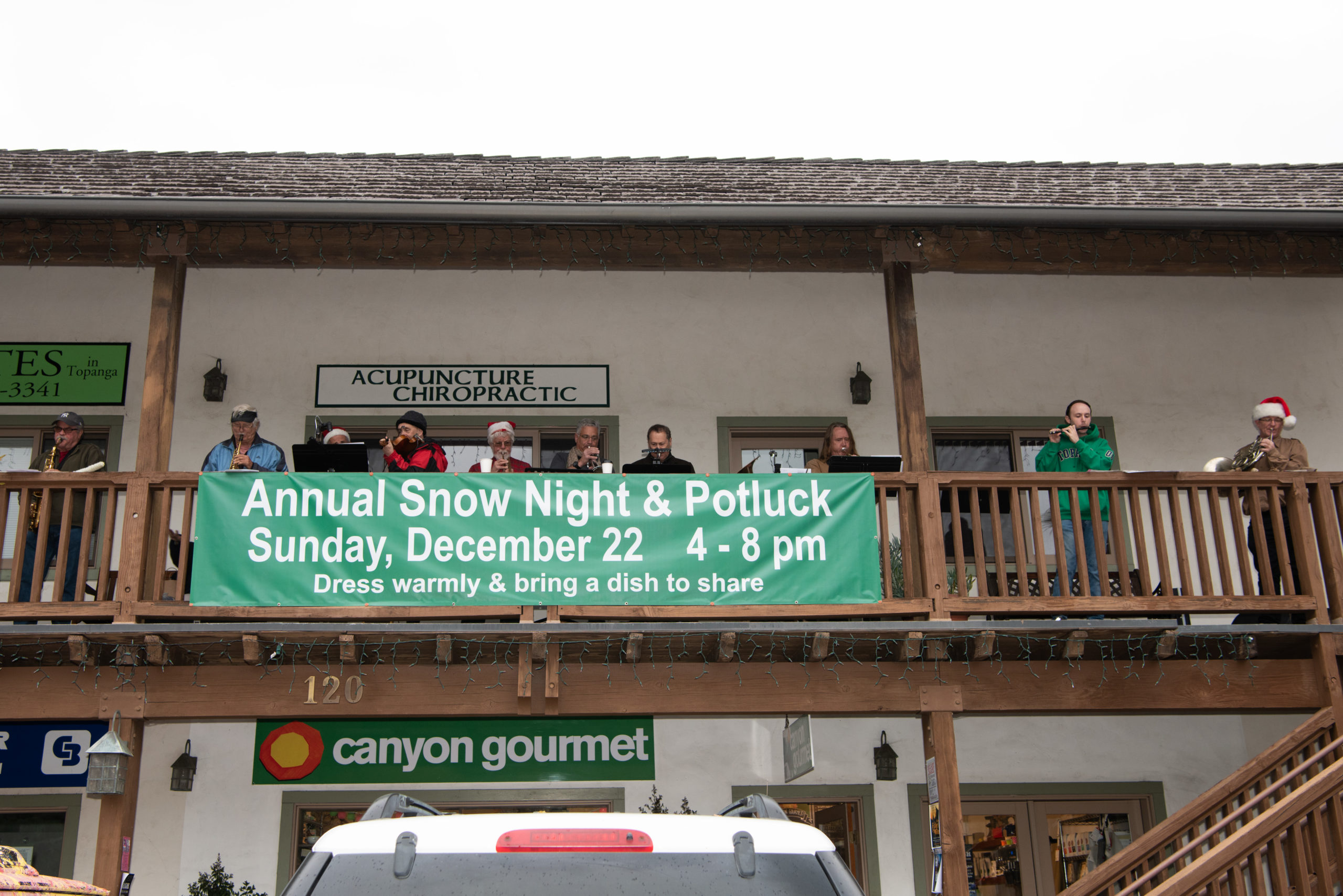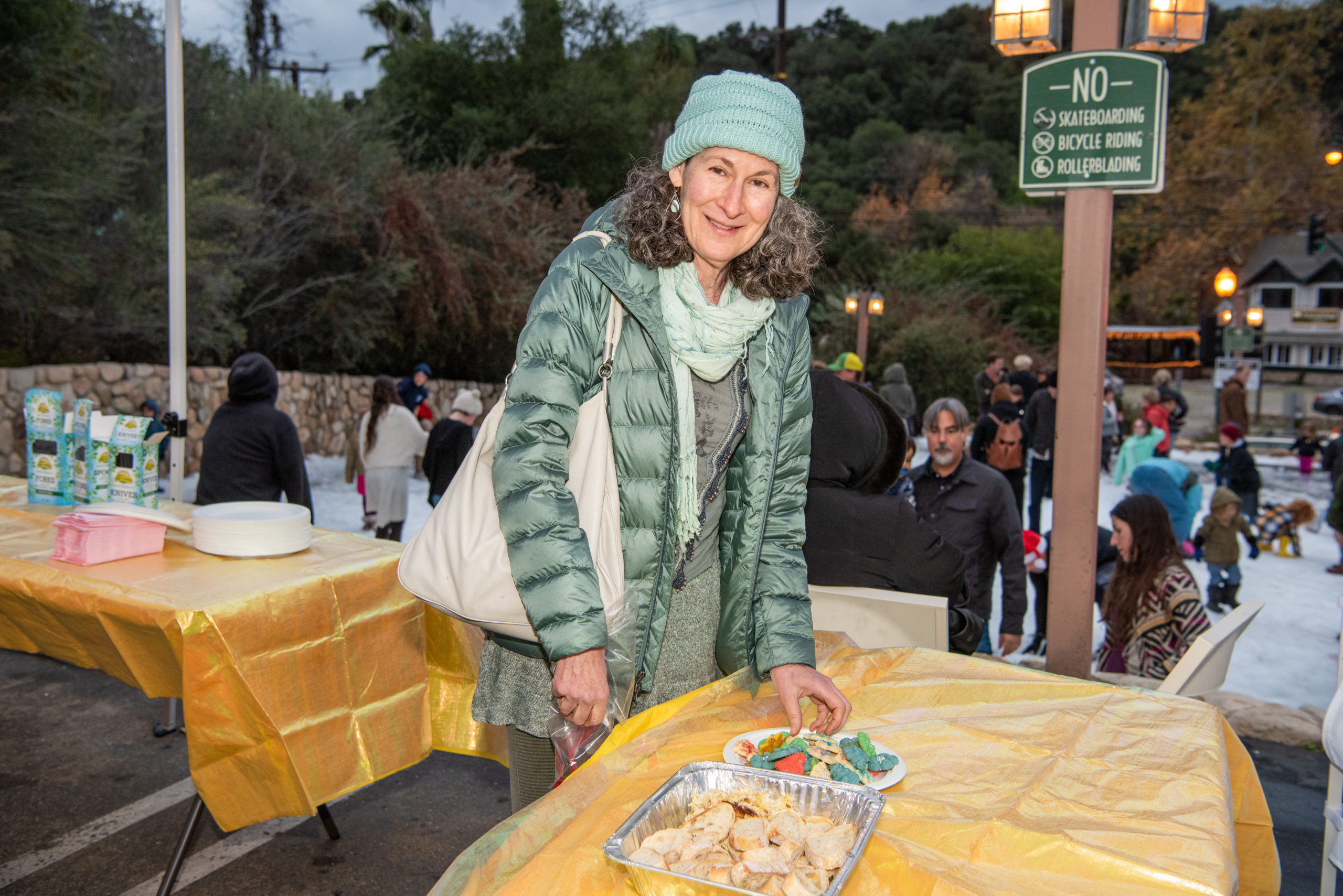 The intrepid snowman, created early on while the snow was fresh, stood its ground against flying snowballs, rambunctious kids and, of course, the rain. A 10-by-12-foot canopy protected the tables that progressively welcomed the traditional potluck array of pizzas and homecooked dishes as they arrived, among them a big pot of Linda Hinrich’s and Randy Just’s hearty chili. Doug Roy and Topanga’s All-American Howling Coyote (Jingle Bells) Brass Band struck up “Joy to the World,” and everyone joined in.
