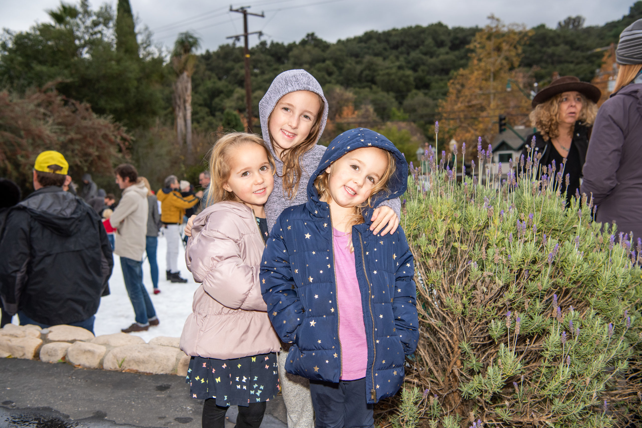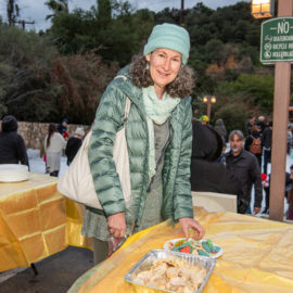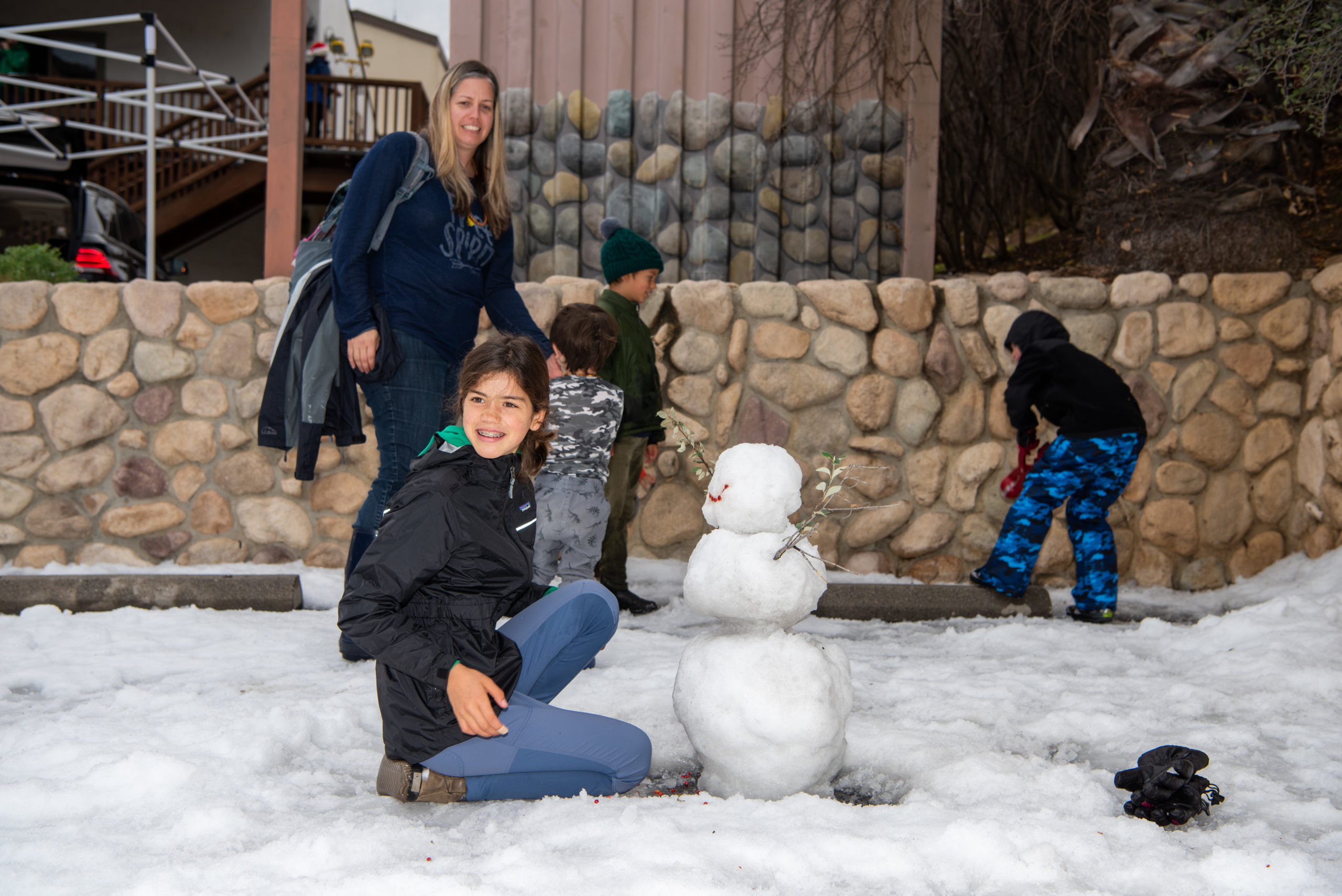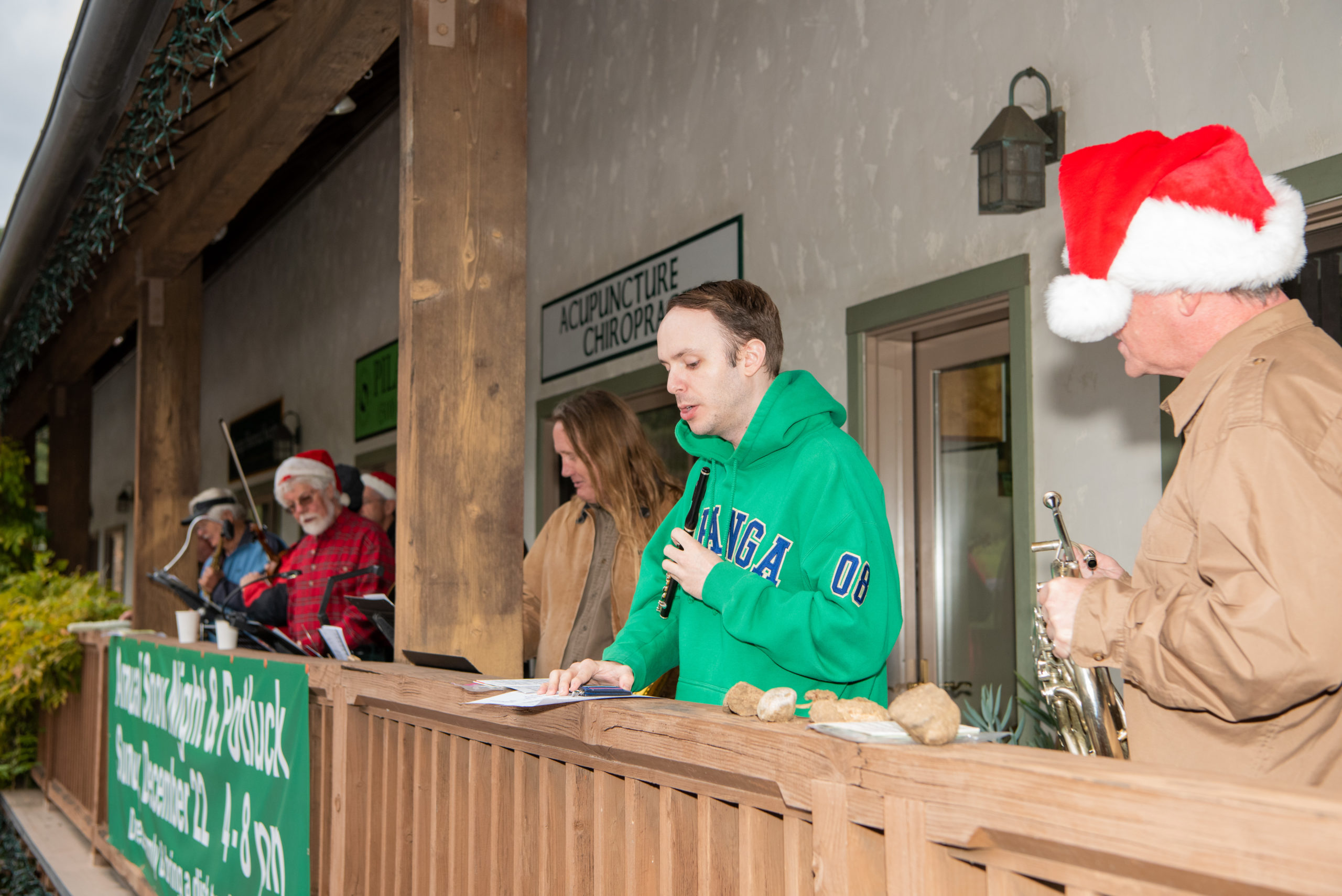The intrepid snowman, created early on while the snow was fresh, stood its ground against flying snowballs, rambunctious kids and, of course, the rain. A 10-by-12-foot canopy protected the tables that progressively welcomed the traditional potluck array of pizzas and homecooked dishes as they arrived, among them a big pot of Linda Hinrich’s and Randy Just’s hearty chili. Doug Roy and Topanga’s All-American Howling Coyote (Jingle Bells) Brass Band struck up “Joy to the World,” and everyone joined in.