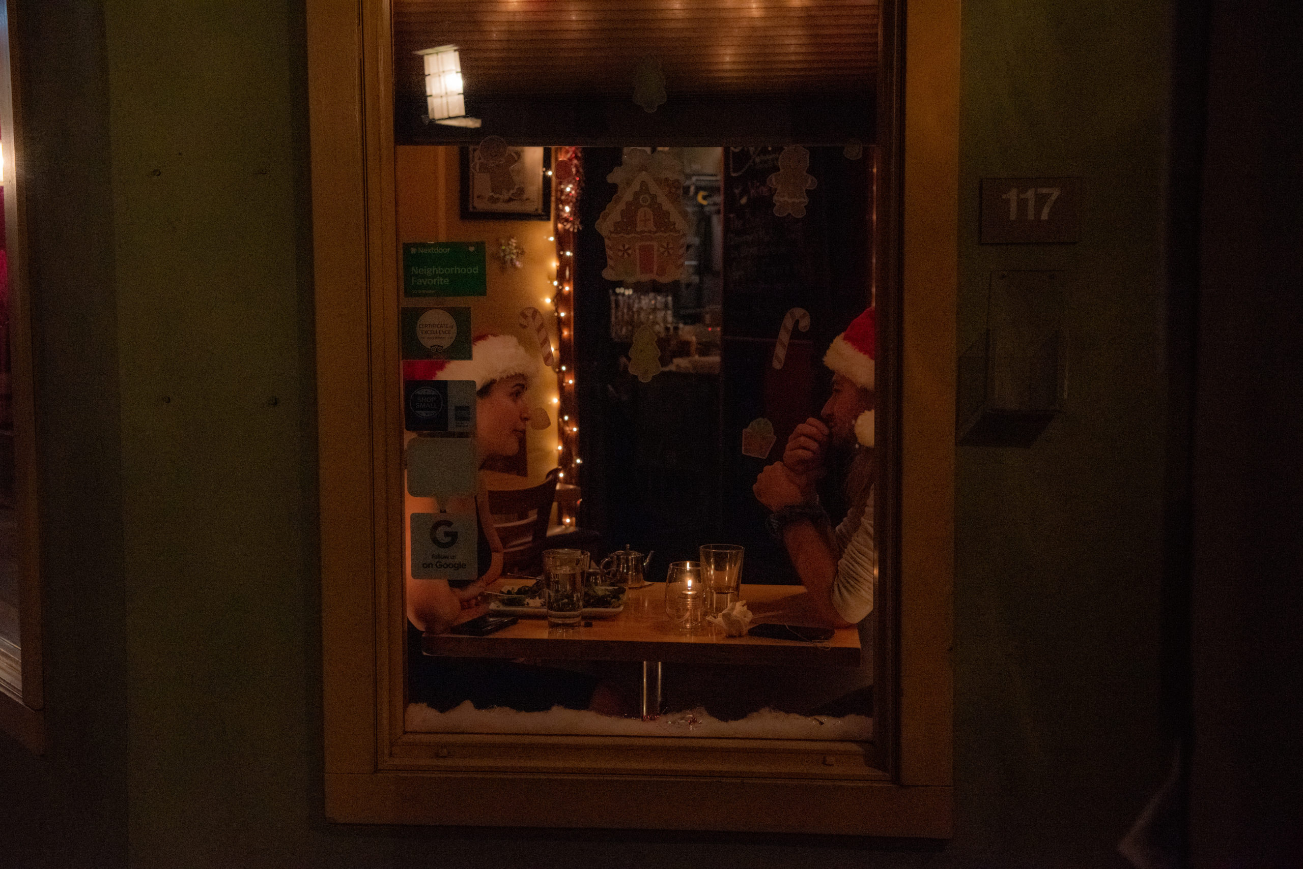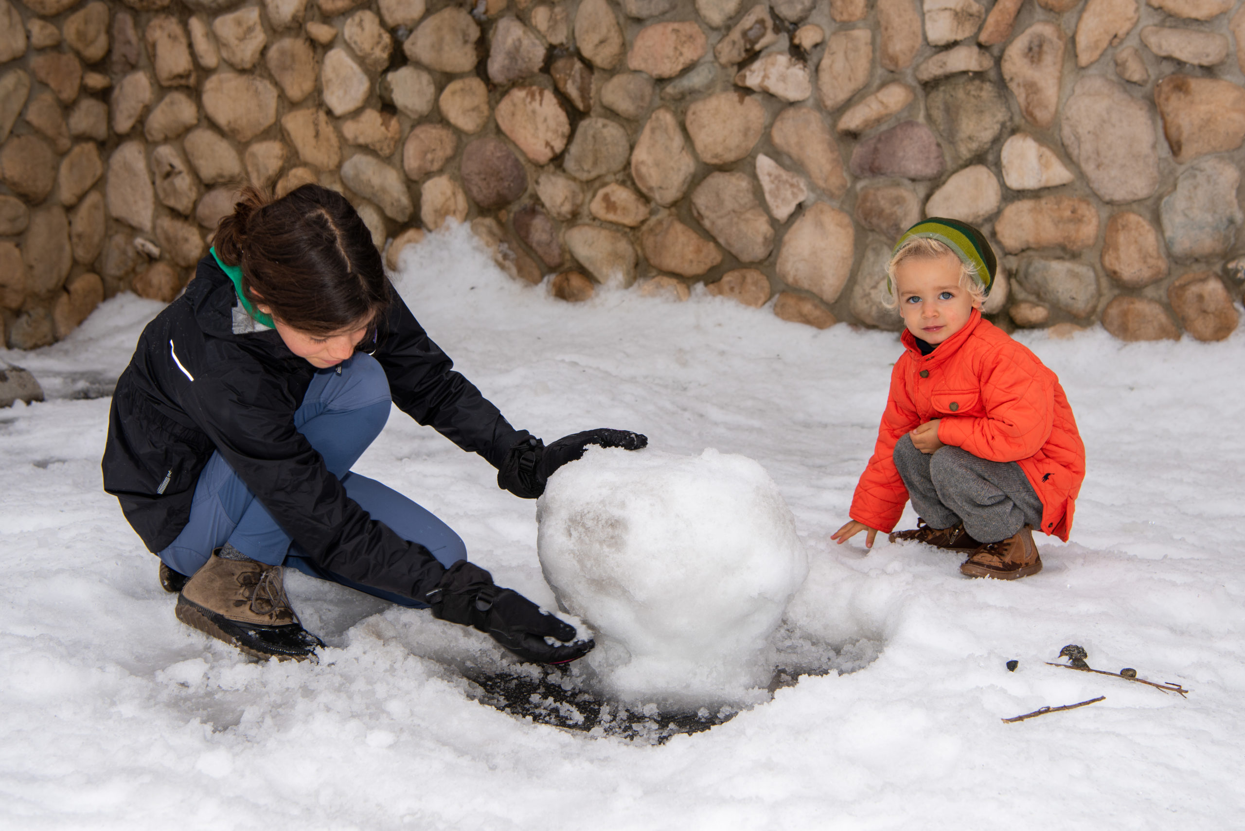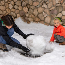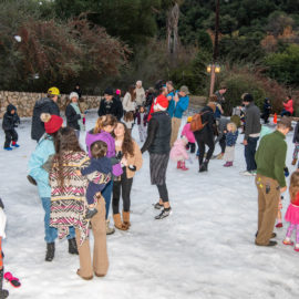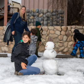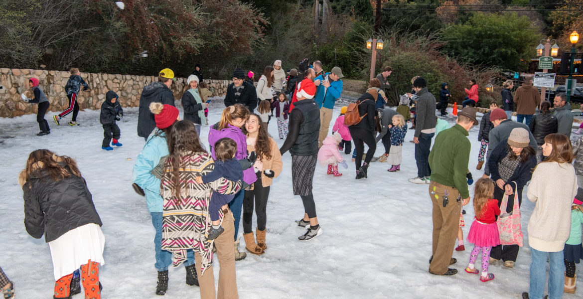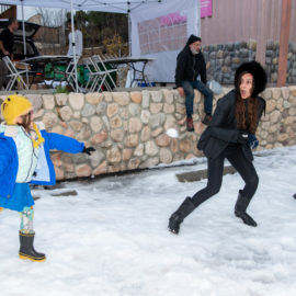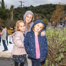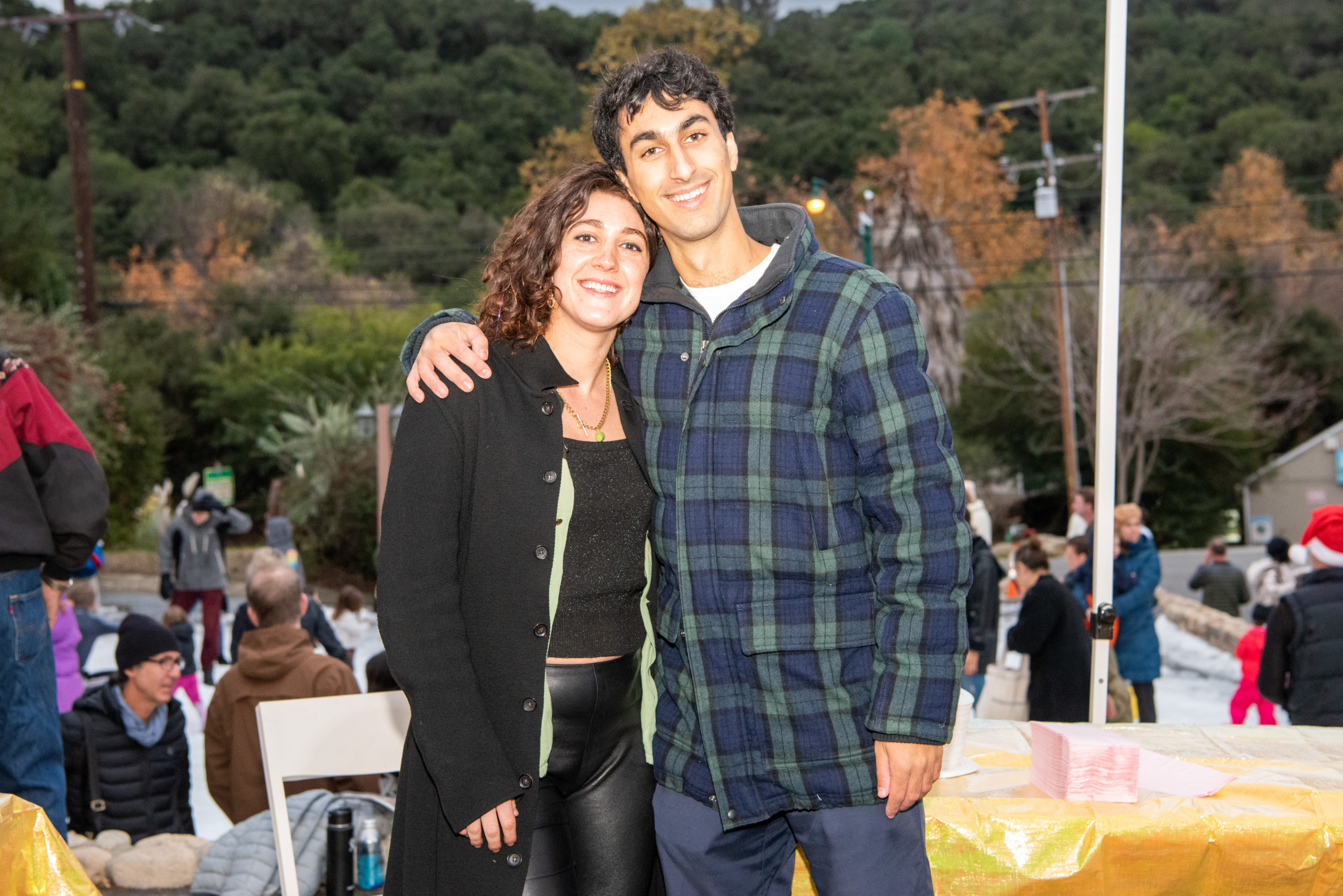 The intrepid snowman, created early on while the snow was fresh, stood its ground against flying snowballs, rambunctious kids and, of course, the rain. A 10-by-12-foot canopy protected the tables that progressively welcomed the traditional potluck array of pizzas and homecooked dishes as they arrived, among them a big pot of Linda Hinrich’s and Randy Just’s hearty chili. Doug Roy and Topanga’s All-American Howling Coyote (Jingle Bells) Brass Band struck up “Joy to the World,” and everyone joined in.