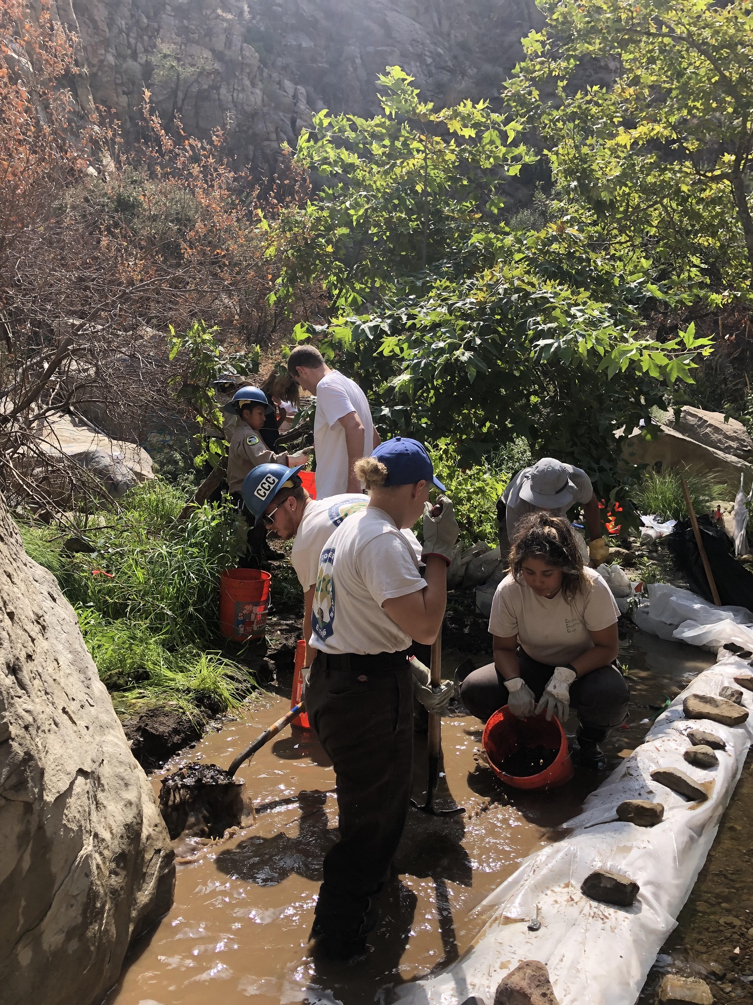 It is always a challenge to obtain permits for work in streams, but especially so when sensitive, threatened or endangered species are involved. California Department of Fish and Wildlife, Regional Board and the Coastal Commission all came through in time and the next hurdle was coordinating with the California Conservation Corps crew in Camarillo to get enough help to do all the work by hand.