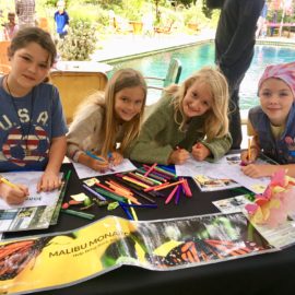 Sergio Jimenez, plant propagation specialist for the Mermaid, sold native butterfly host and nectar plants. Visitors enjoyed a live beehive from Greener Power Empowerment Foundation and honey from Eli’s Bees. Local artists Matt Doolin of Topanga Art & Tile, and Anneli Vasser offered nature-themed tiles and jewelry for sale. Local artist David Russo captured the event in a beautiful art piece that he painted throughout the day. His piece will be auctioned to support Topanga Elementary.