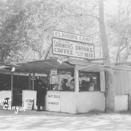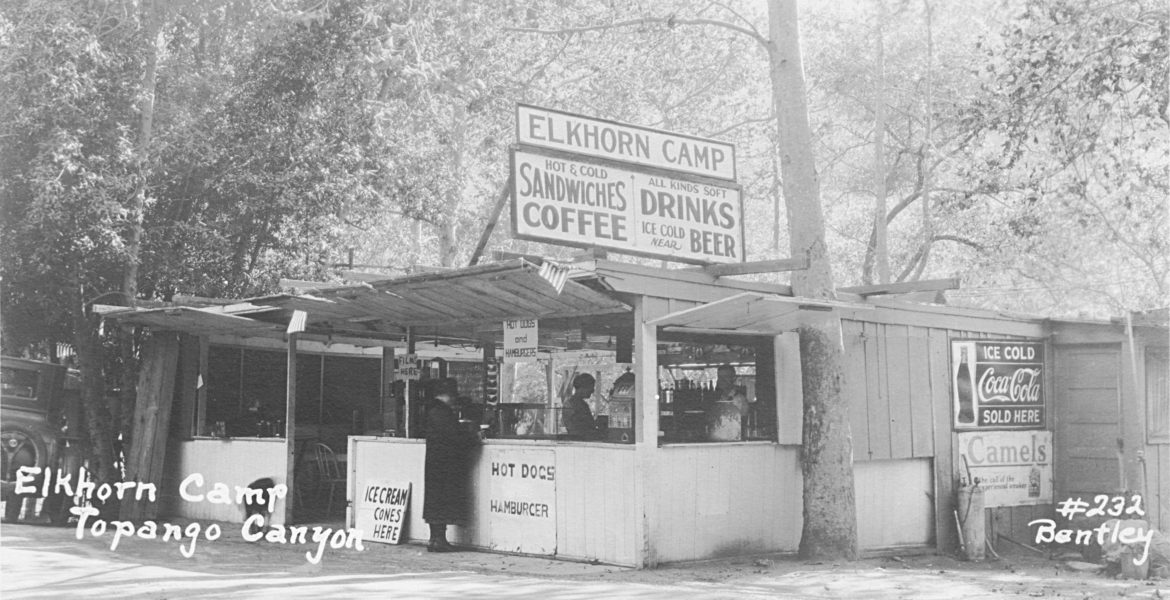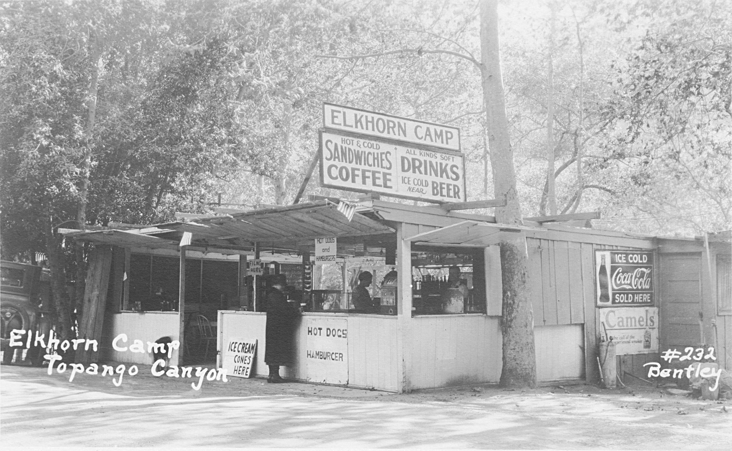 One of the earliest resorts in Topanga was Elkhorn Camp, built along the creek about a mile from the beach, just far enough away from the chain gang camp. Little is known about this resort, but it must have appeared after the Topanga road was reopened in 1915. It had seven cabins, a cafe, and an open-air dance hall. Two floods destroyed it, one in 1916, and one in 1938, after which it was not rebuilt.