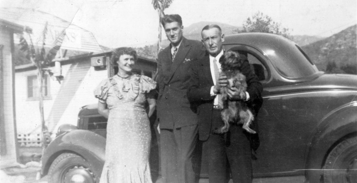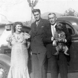 Florence Spence, Jake Fields, and William Spence with Skippy the dog,1936.