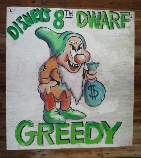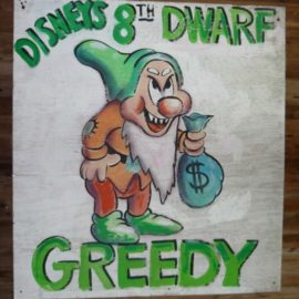 We loved that guy. He came to my door the day after our Summit Valley victory with a self-portrait in neon paint he knew I loved and gave it to me as a thank you. They lived for years in the Glenview neighborhood overlooking Summit Valley. We did an interview up on Stewart’s roof with the Daily News about the battle. He also is the father of the “8th Dwarf Greedy” sign and carried that sign to our protest march at Disney’s Burbank Studios, where, a week before the final hearing, we (children, moms and dads) marched beneath the building [that is] enshrined with all seven dwarfs. “Greedy” went viral before there was an internet, and showed up in a couple of news stories about Michael Eisner, then CEO of Disney, well after the battle. It was also rumored, but never verified, that Eisner picked up the phone and called the RETLAW folks (the developers) the day of our little march, urging them to stop the development because it was giving Disney a bad name. Our signs read: “They make nature shows, but it’s nature they bulldoze,” and “Save our Bambis, save our Thumpers.”