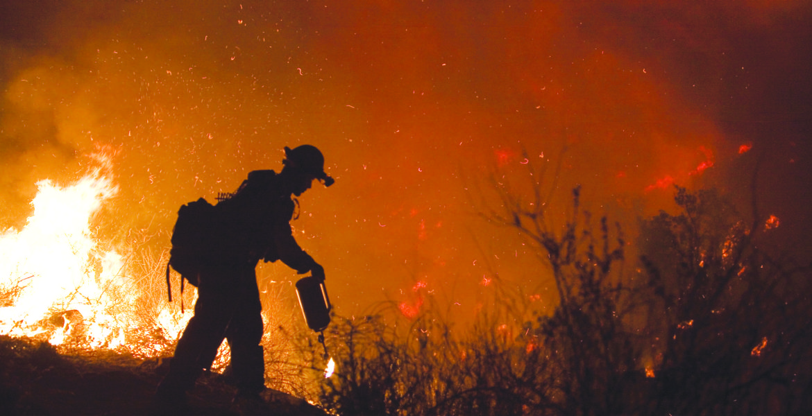Above, fire crew member fighting Poomoocha wildfire in California. Photo by FEMA