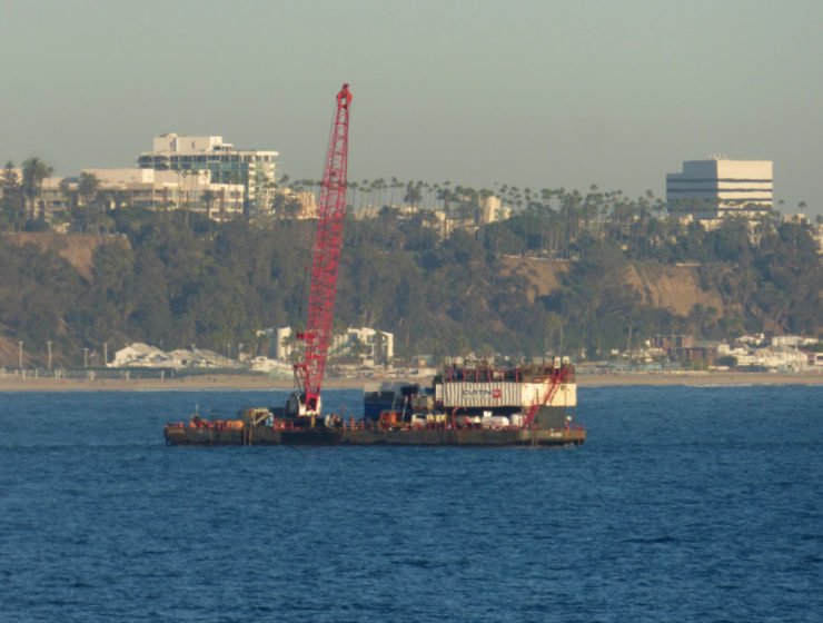 A crane atop a barge anchored off Sunset Boulevard in the Santa Monica Bay is…