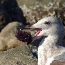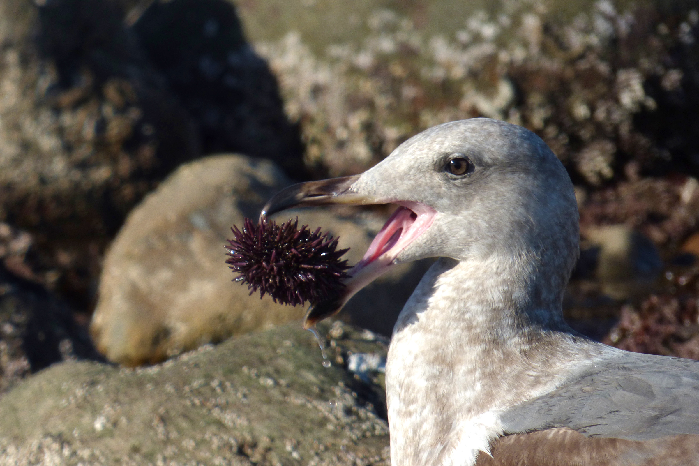 A juvenile gull tries to swallow a sea urchin whole. Older, wiser birds sometimes carry