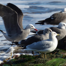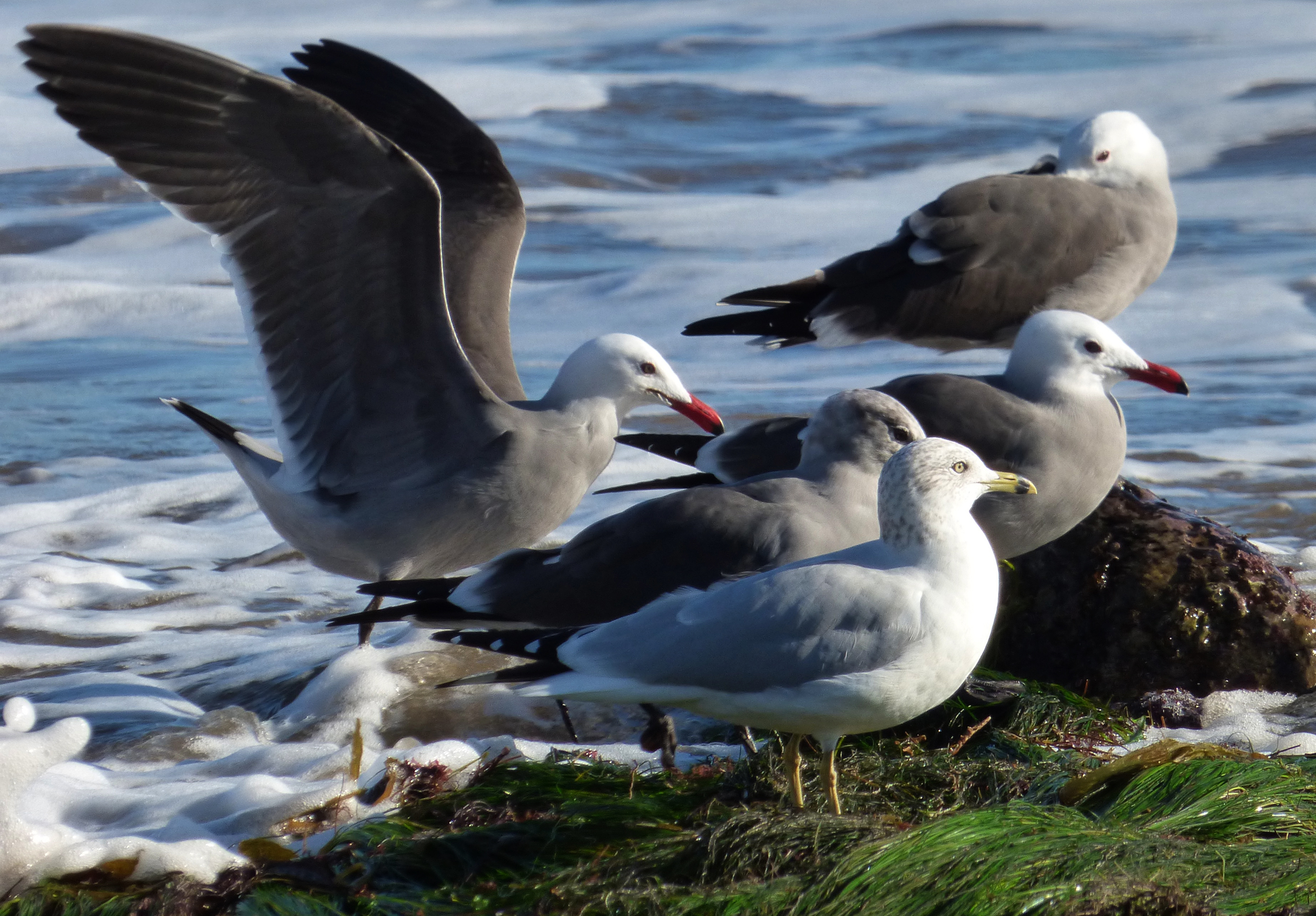 gray and white Heermann’s gulls and a much paler ring-billed gull.