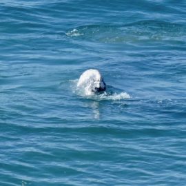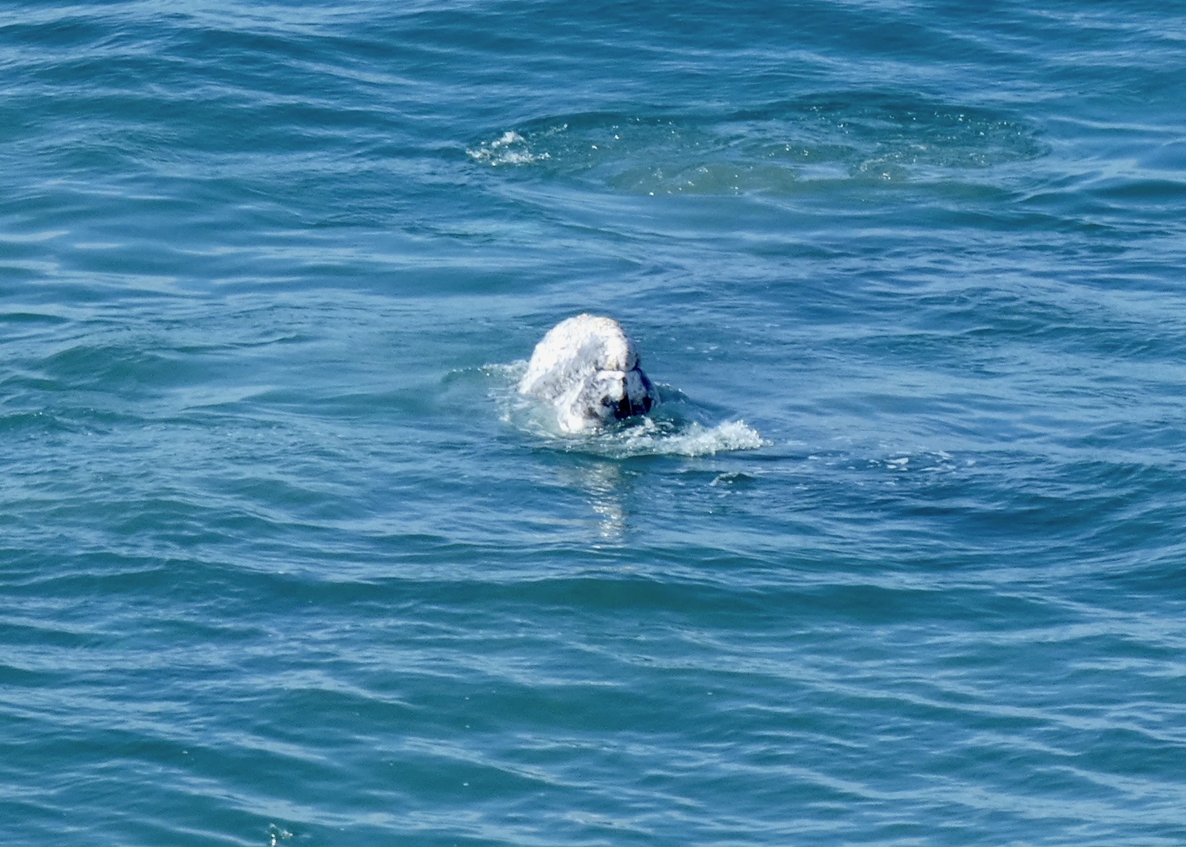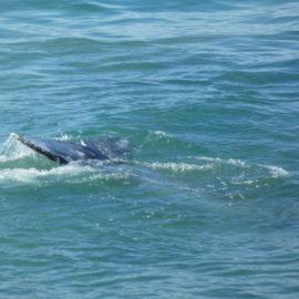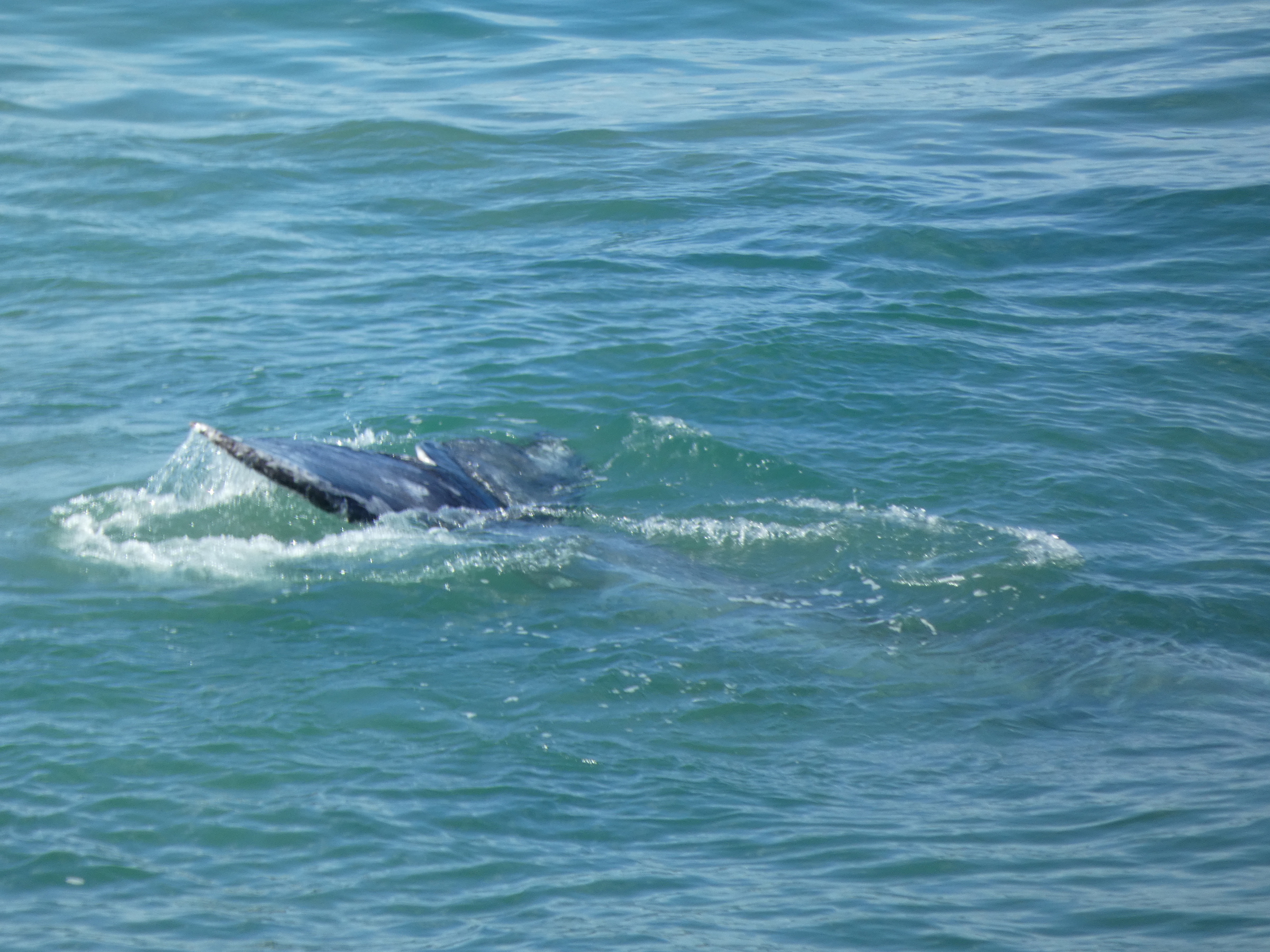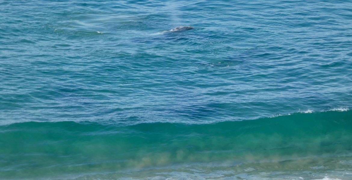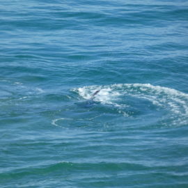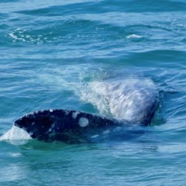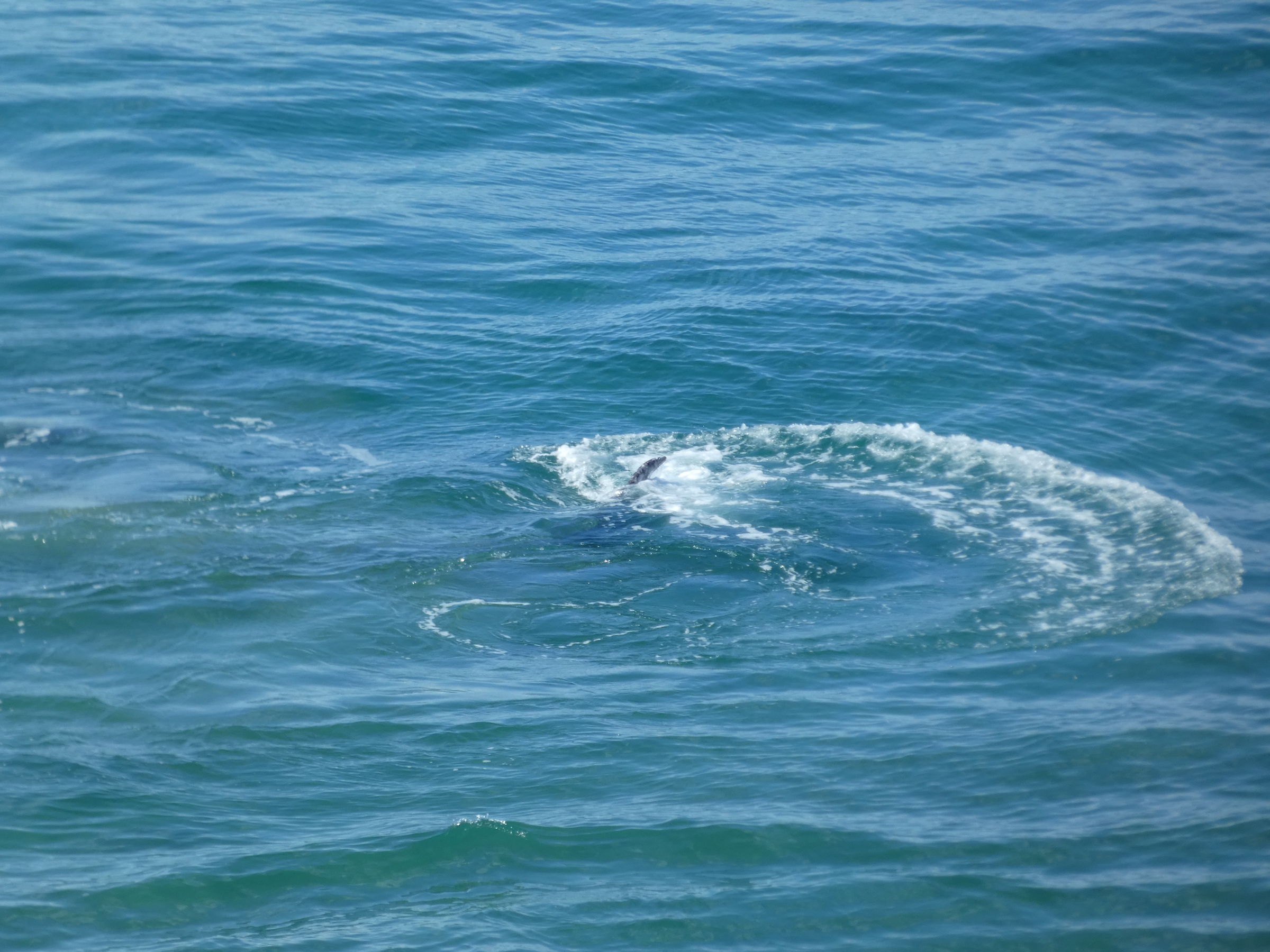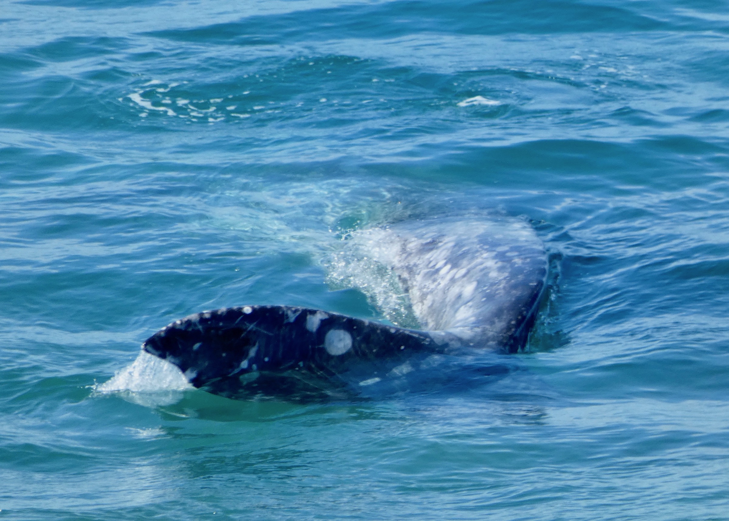 Gray whales don’t have dorsal fins but they do have powerful flippers. This whale is creating an easy to spot disturbance in the water, even though only one flipper is visible above the surface of the water as it rolls over. The ring of ripples the whale leaves on the surface of the water is one of the best indicators that a whale is nearby.