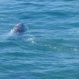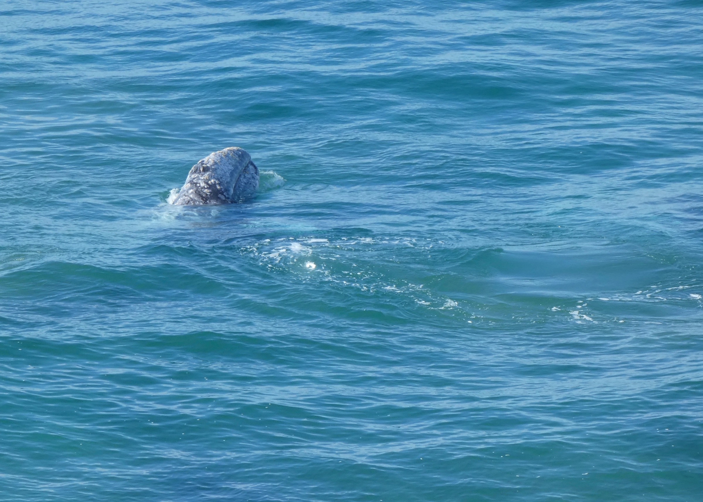 Gray whales feed on the ocean floor, straining small invertebrates out of the mud through baleen filters, but they are mammals and must come up to breathe. They also seem to like to take a look around, behavior officially known as spyhopping.