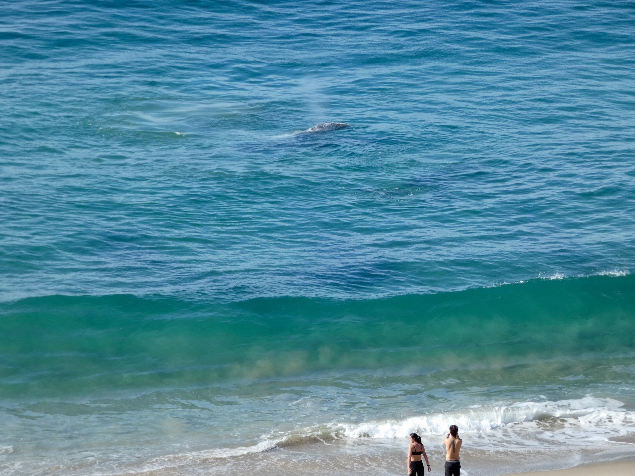This whale was right in the surf break, so close that watchers on the beach could hear it breathing. Often all one sees is a distant spout on the horizon.
